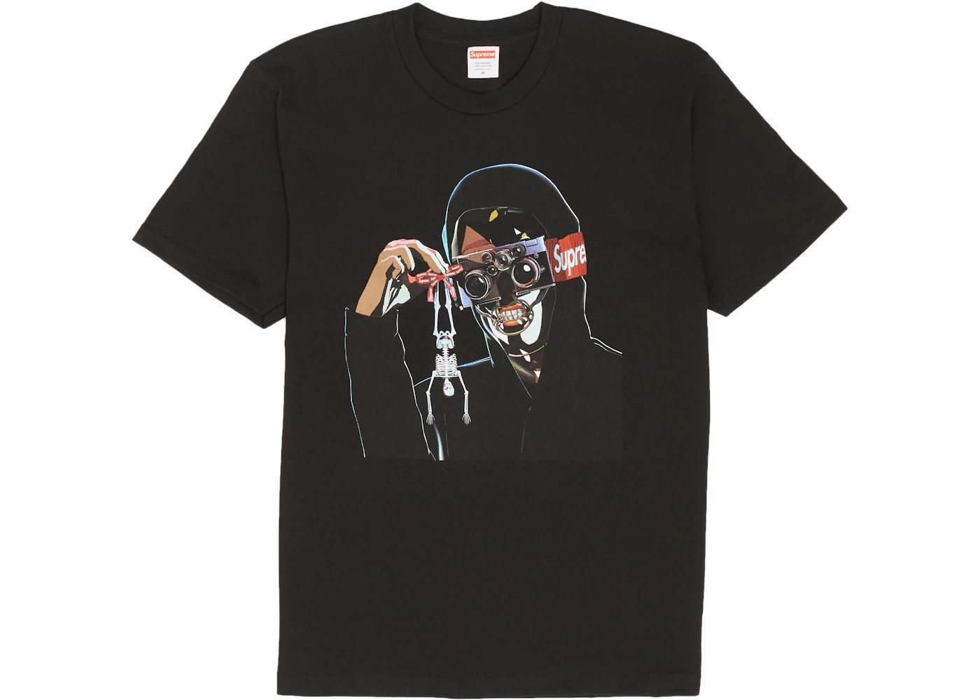 Supreme has produced a wealth of different shirts over the years, but the Supreme Creeper Tee stands out for having accomplished a truly extraordinary feat: making creepy cool. The Supreme Creeper Tee is made of 100% cotton and will immediately turn heads because of the striking and eye-catching design emblazoned on the front of it. It features a drawing of a robot-like figure in a black hooded sweatshirt baring his teeth. The lower half of the figure’s face is white, he has a camera strapped to the upper half of his face with camera lenses for eyes, and he is seen holding up a small skeleton with his hand and dangling it by its ankles. This is the Creeper, and the Supreme logo is plastered across the side of his head. The T-shirt itself comes in a cool black. The black Supreme Creeper Tee released in February of 2019 and retailed for $38. - Season SS19 - Color Black - Release Date 2019-02-21 - Retail Price 38 - Featured false