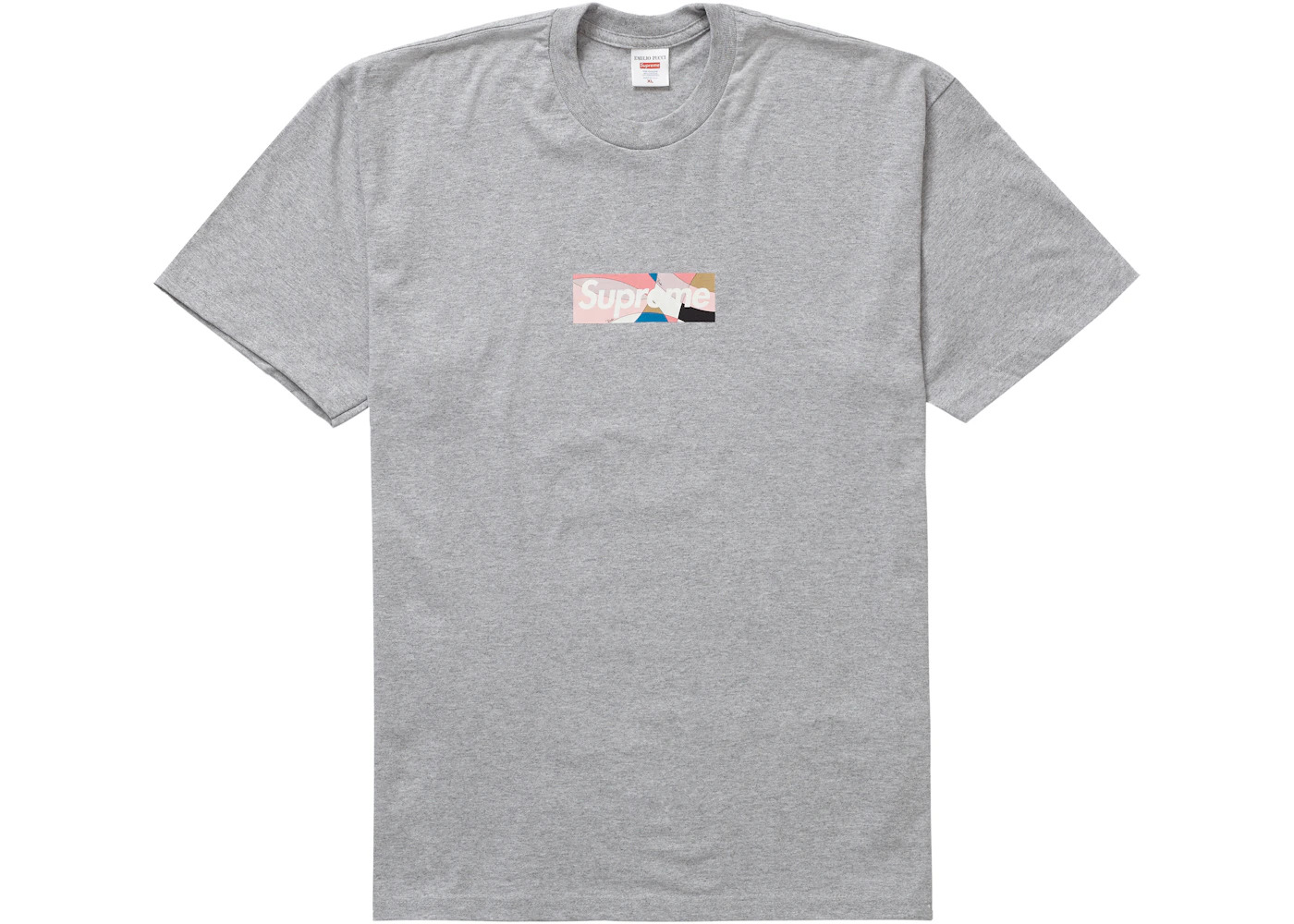This grey Supreme Box Logo T-shirt was released in collaboration with Emilio Pucci for Week 16 of the streetwear brand's Spring/Summer 2021 season. This collaboration featured more than 40 different Supreme Emilio Pucci items from soccer jerseys to silk smoking jackets. Nine new Box Logo T-shirts were released as a part of the two brand's Spring/Summer 2021 collaboration and each features Emilio Pucci's archival Fantasia print as the Supreme Box Logo background. This particular t-shirt features a dusty pink version of the Supreme Emilio Pucci Logo on a grey t-shirt. The Supreme Emilio Pucci Box Logo T-shirt in Grey and Dusty Pink was made available on June 8th, 2021, at the retail price of $54 USD. - Season SS21 - Color Heather Grey/Dusty Pink - Release Date 2021-06-10 - Retail Price 54 - Featured false