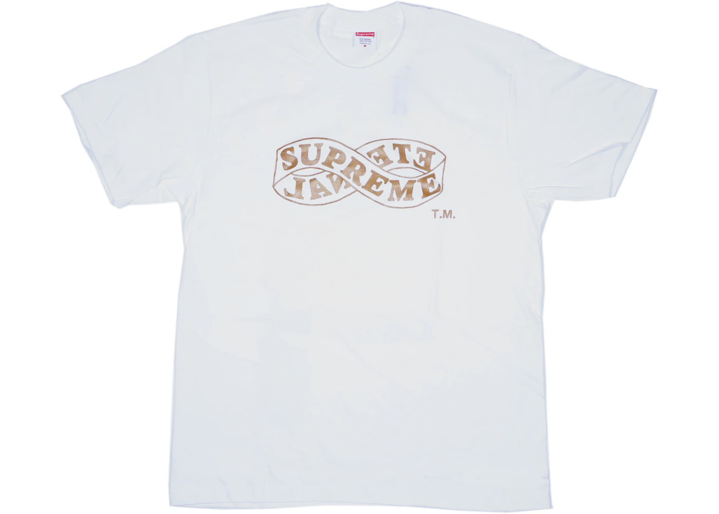 Supreme released the Supreme Eternal Tee (FW18) White in collaboration with Eternal, a Christian clothing company known for the production of faith-inspired apparel with a touch of contemporary designs. The t-shirt adopts a crew neckline with a rib-knit material and elastic qualities for a comfortable fit. A white neck label with a "Supreme" box logo is visible at the back of the neckline, and both sleeves are short and have padded cuffs. On the chest is a bold gold graphic of the infinity symbol, representing the infinite power of God. It is embellished by the "Supreme" name on the front and "Eternal" on the rear looping end. Besides the contrasting gold hits, the t-shirt is mostly an unadorned, elegant white material. What do StockX experts find outstanding about Supreme Eternal Tee (FW18) White? We love the graphic gold imprint accenting the white colorway that allows wearers to express their faith in a classy, refined manner. The t-shirt was released on September 20th, 2018, at a retail price of $36. - Season FW18 - Color White - Release Date 2018-09-20 - Retail Price 36 - Featured false