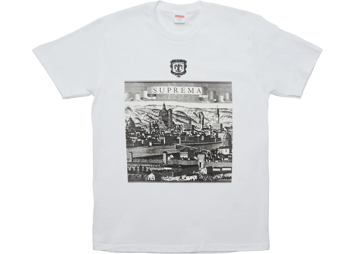 The Supreme Fiorenza Tee in White encapsulates a fusion of art, elegance, and streetwear aesthetics, showcasing meticulous design and premium construction. Crafted from soft cotton, the Supreme Fiorenza Tee White exudes comfort and quality, featuring a classic crew neckline and short sleeves for a relaxed fit. The tee boasts a detailed and elaborate greyscale print depicting a stunning cityscape intricately showcased across the chest. This print amalgamates artistic expression with Supreme's urban aesthetic, crafting an intriguing contrast between classical artistry and modern street culture. The subtle yet refined white backdrop allows the artwork to stand out vibrantly, adding depth and character to the tee's overall aesthetic. The wow factor of the Supreme Fiorenza Tee White lies in its detailed print showcasing the stunning cityscape in greyscale. We think this intricate and carefully crafted artwork melds classical artistry with streetwear culture, elevating the tee's visual appeal with its fusion of elegance and urban style. The tee retailed for $36 when it was released on the 29th of March 2018. - Season SS18 - Color White - Release Date 2018-03-29 - Retail Price 36 - Featured false