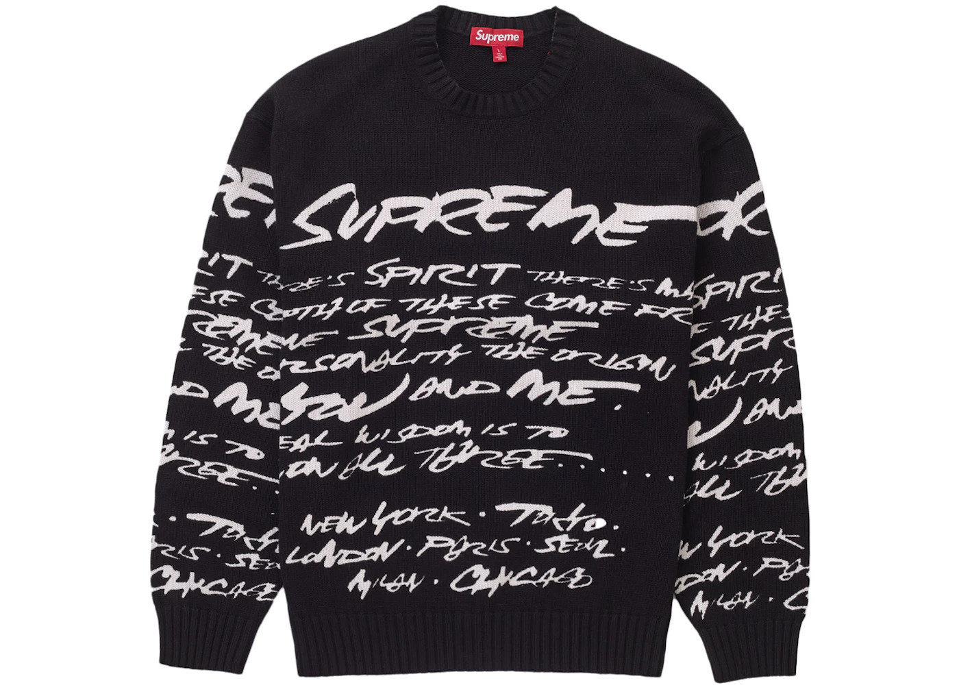 The Supreme Futura Sweater Black is a 100% cotton knit long-sleeve sweater with a crew neck. The sweater’s base is black knit, and white text appears from the chest down to the waistband and cuffs. Supreme branding starts with the wraparound text print, appearing on the chest, back, and sleeves and the text continues downward in a smaller size. Additional Supreme branding appears on the woven label at the collar. New York-based skate gear and clothing brand Supreme has a long history of artist collaborations. With the Futura Sweater, Supreme has transcribed legendary New York graffiti artist Futura’s handwriting into a print, transcending the art form into a new textile medium, the knitted sweater. Our experts feel that the best feature of the Futura Sweater is its text pattern, an innovative knitwear design technique. The Supreme Futura Sweater Black was released on February 15, 2024, and retailed at $168. - Season SS24 - Color Black - Release Date 2024-02-15 - Retail Price 168 - Featured false - Requester Kelsey K - Uploaded By LL