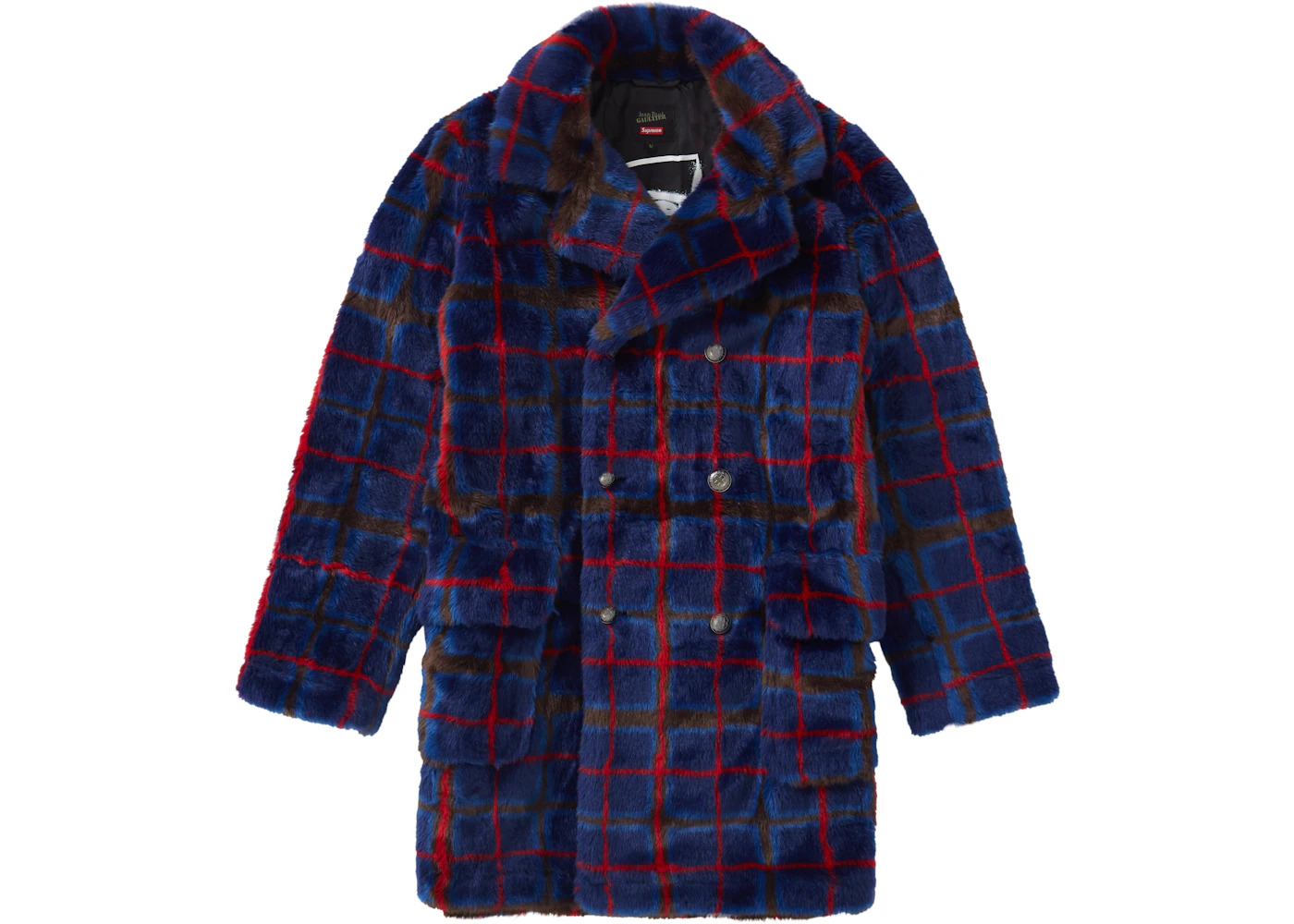 Supreme Jean Paul Gaultier Double Breasted Plaid Faux Fur Coat Blue