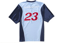 The Supreme Jordan Warm Up Jersey Light Blue is a jersey made as a collaboration between the streetwear brand and the Jordan athletic brand. This iteration of the Supreme Jordan Warm Up Jersey comes in a Light Blue color, which dominates the front and back. A darker navy blue is seen on the sleeves and in stripes up the sides. The number 23 is seen embroidered on the front and back in red, while the Supreme logo appears across the top of the back in white. A small red Jumpman logo is seen just under the v-neck collar, and a Jordan patch is found on the bottom of the front. What we like best about this jersey is the red numbering, which really stands out against the blue background. The Supreme Jordan Warm Up Jersey Light Blue released on October 3, 2024, for a price of $148. - Season FW24 - Color Light Blue - Release Date 2024-10-03 - Retail Price 148 - Featured false - Requester Kelsey K - Uploaded By LL