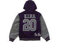 This Hooded Supreme Varsity Jacket dropped in October of 2020, as a part of the brand's FW20 Week 9 release. The jacket is made from a wool body with cowhide leather sleeves and a quilted Satin lining. The Supreme jacket features an embroidered and chenille logo across the chest and back and includes a number of other maximalist details pointing to the brand as well. The year 2020 can be found on the front and the number 20 on the back as the jacket clearly pays homage to the calendar year. This Supreme Varsity Jacket released at a retail price of $448 USD. - Season FW20 - Color Purple - Release Date 2020-10-22 - Retail Price 448 - Featured false