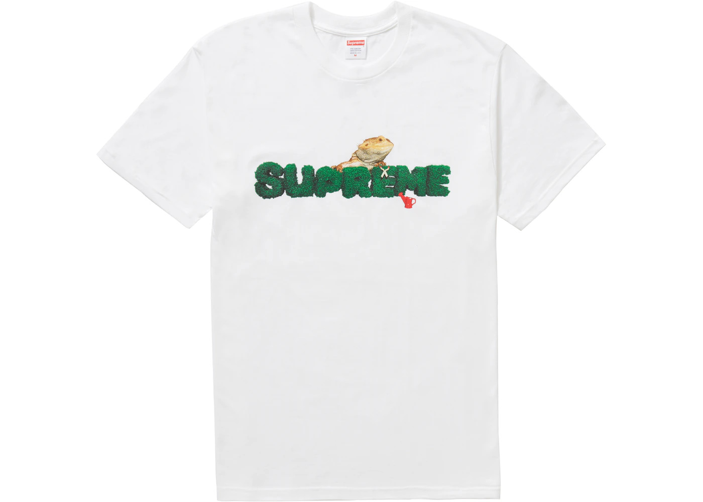 The Supreme Lizard Tee White, made entirely of cotton material, has become a part of the t-shirt collection of the popular lifestyle brand. This Supreme Lizard Tee is covered in a pure white color scheme and features a graphic decoration on the chest area. The art comprises a printed Iguana that seems to look over a green Supreme graphic logo and a small red watering can below it. A white logo tag is also displayed on the inner collar region. Additionally, it also features a round neckline and short sleeves. The Supreme Lizard Tee White was released on the market on July 2nd, 2020 and retailed at a price of $38. - Season SS20 - Color White - Release Date 2020-07-02 - Retail Price 38 - Featured false