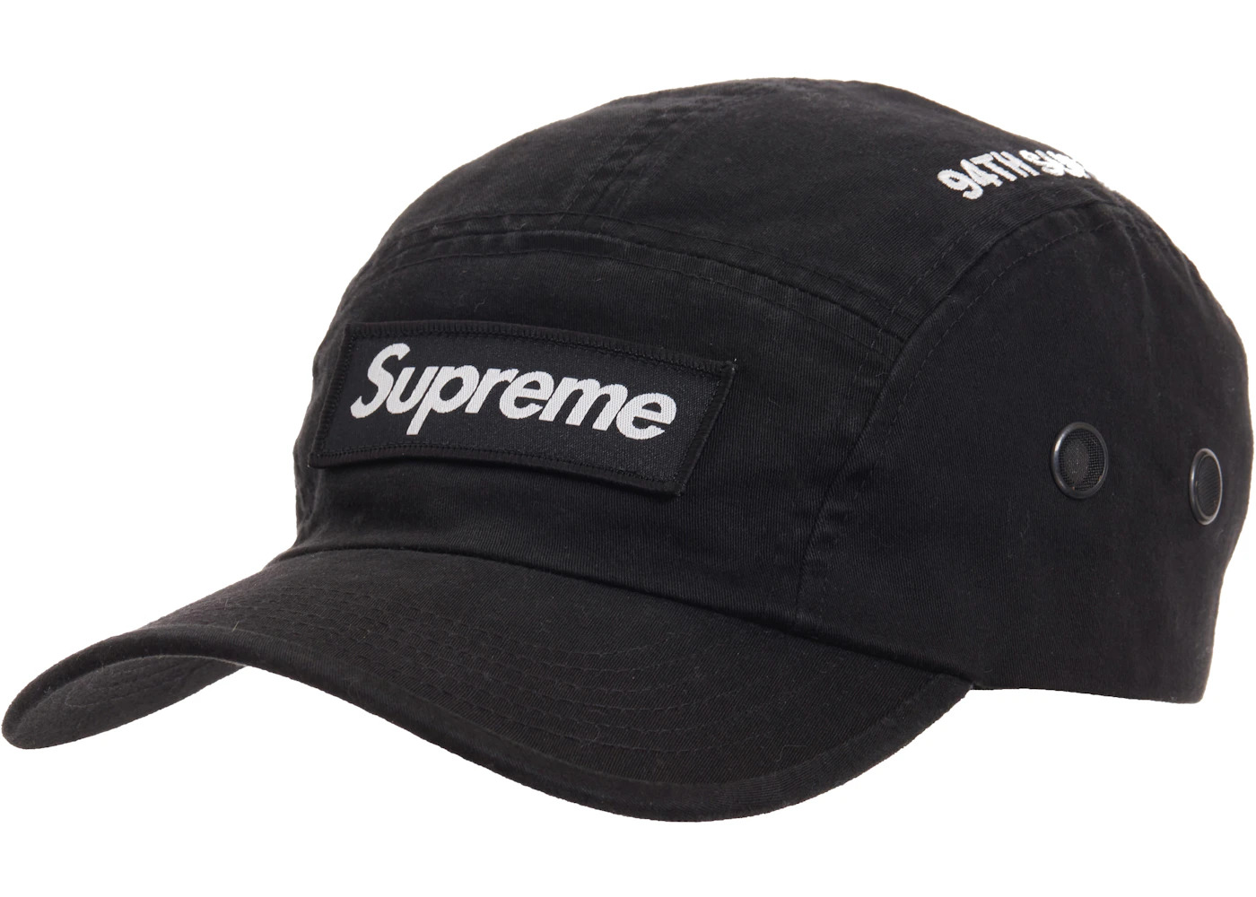 The Supreme Military Camp Cap FW21 Black is made of cotton and sports a simplistic style and all-black color scheme. It has a signature logo box on the front and a large and bold embroidered motif showing the Supreme brand in white over a black background. Supreme Military Camp Cap FW21 Black has an adjustable strap in the back, enabling you to adjust it to your preferred fit. It also features a curved peak to better protect your face from harsh sun or rain. The cap can be paired with any look to complete a casual streetwear outfit. The Supreme Military Camp Cap FW21 Black was launched in September, 2021, at a retail price of $48. - Season FW21 - Color Black - Release Date 2021-09-16 - Retail Price 48 - Featured false - Styles Headwear