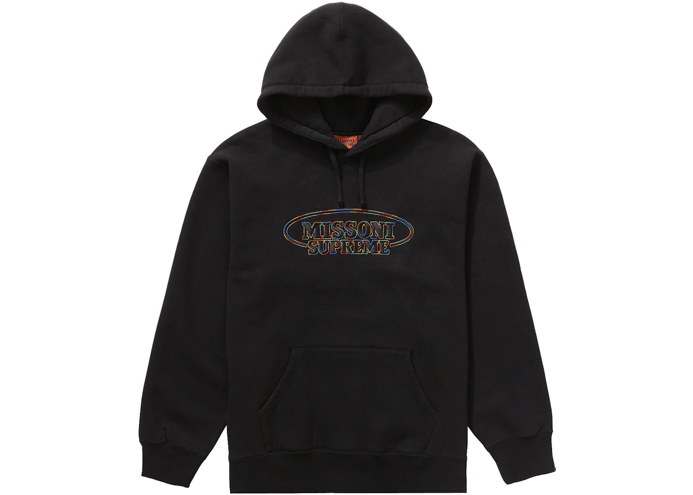 This black Supreme Missoni Hoodie was released in November of 2021 as a part of the two brands' collaborative delivery that was featured in the streetwear brand's Fall/Winter 2021 season. The release primarily included Supreme and Missoni knitwear as well as three colorways of this hoodie. The hoodie features a co-branded Supreme x Missoni logo in its chest in rainbow embroidery. The Supreme Missoni Hoodie was released at the retail price of $178 on November 18th, 2021. - Season FW21 - Color Black - Release Date 2021-11-18 - Retail Price 178 - Featured false