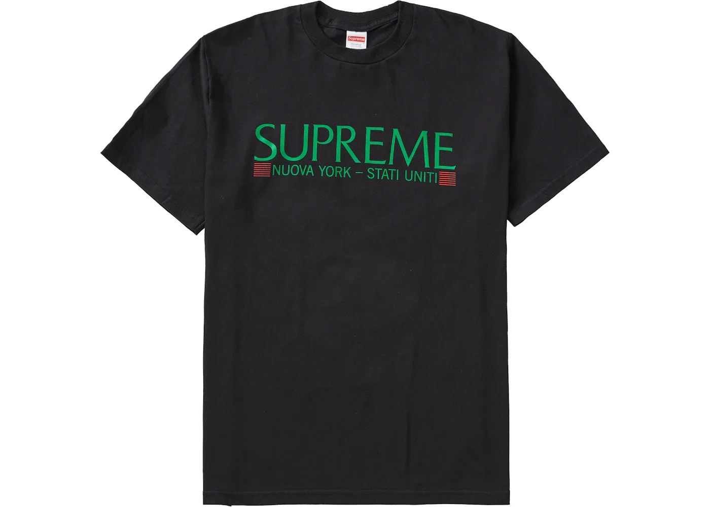 This black t-shirt released as a part of Supreme Fall/Winter 2020 Week 1 along with nine other new graphic t-shirts. The Nuova T-shirt's graphic features the word Supreme above the phrase "Nuova York - Stati Uniti" which is Italian for "New York, United States." The Supreme Nuova T-shirt released on August 20th, 2020 and retailed for a price of $38 USD. - Season FW20 - Color Black - Release Date 2020-08-20 - Retail Price 38 - Featured false