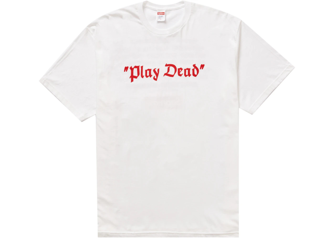 The Supreme "Play Dead" Tee White is a short-sleeved garment made out of 100% cotton fabric. This T-shirt features a flat bottom hem, ribbed sleeve openings, and a round collar. The design of the tee by the lifestyle brand is white in color. It also displays highlights of Supreme’s third full-length skate video, called Play Dead. These include a graphic on its front and the names of the individuals involved in the video on its back. The Supreme "Play Dead" Tee White was originally released on the 1st of December 2022. At the time, it had a retail price set at $40. - Season FW22 - Color White - Release Date 2022-12-01 - Retail Price 40 - Featured false