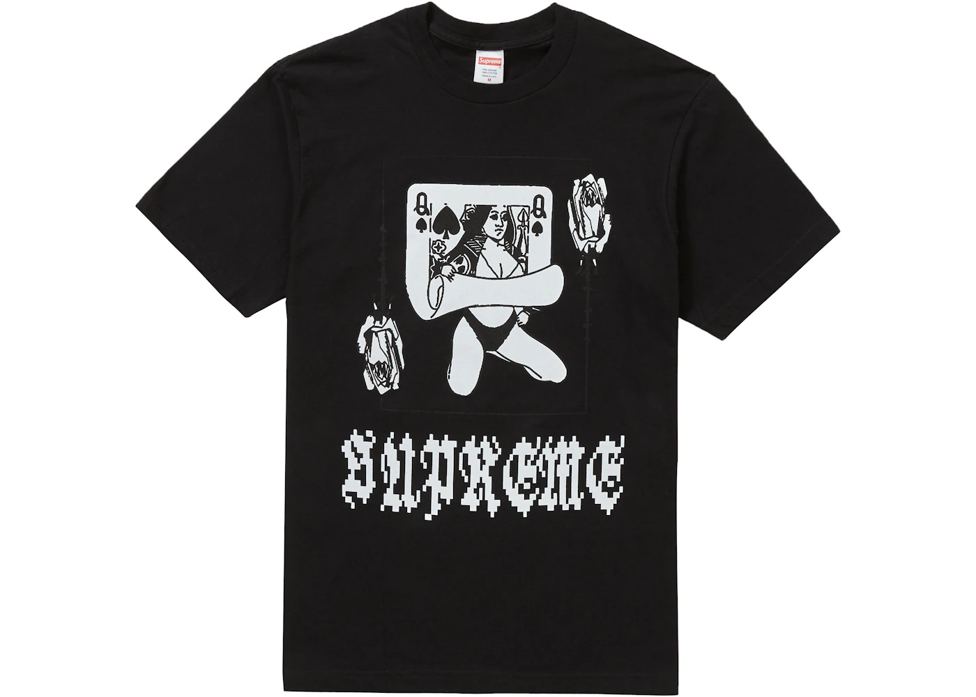 Supreme's Queen Tee was released as a part of Supreme's FW19 Week One drop. The tee was released in 8 colors and features a graphic that says Supreme on the front below a Queen playing card pulled back to reveal a woman underneath. The Supreme Queen Tee was released on August 22nd, 2019 and retailed for $38 USD. - Season FW19 - Color Black - Release Date 2019-08-22 - Retail Price 38 - Featured false