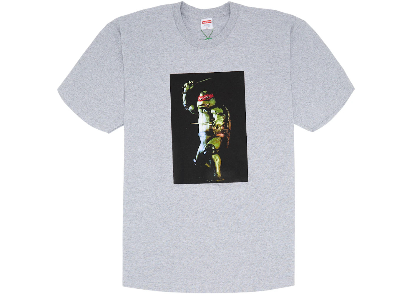 The Supreme Raphael Tee Heather Grey is a short-sleeved graphic Tee made of 100% cotton Heather Grey jersey. The front features a full-color photographic image of Raphael from Teenage Mutant Ninja Turtles standing against a black background, twin sai at the ready, and his red bandana printed with the Supreme logo. Additional Supreme branding appears on the interior collar label. New York-based Supreme is widely known for its graphic t-shirts, which the brand uses to express its aesthetic and inspiration. Teenage Mutant Ninja Turtles originated as a comic and branched off into a television and film series detailing the adventures of New York sewer-dwelling martial artist turtles. Raphael speaks with a Brooklyn accent and is known for being tough and rebellious, hallmarks of Supreme’s brand ethos. Our experts feel that the Raphael Tee's best feature is its image, which speaks volumes from its inconspicuous branding. The Supreme Raphael Tee Heather Grey was released on February 18, 2021, and retailed for $44. - Season SS21 - Color Heather Grey - Release Date 2021-02-18 - Retail Price 44 - Featured false