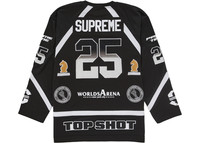 The Supreme Rhinestone Hockey Jersey Black is made from a breathable black polyester mesh. It is a pullover V-neck jersey featuring white motifs on the chest, sleeves, and lower front and back, all of which are embellished with rhinestones. The rhinestone graphic details add a shimmering effect to the Supreme Rhinestone Hockey Jersey, contrasting against the black body of the jersey. The printed graphics include "Prime Time 25" on the sleeves and the back, a wildcat in the center of the chest, and a "top shot" written across the bottom of the back of the jersey. The Supreme iconic logo is written on the front, along the bottom panel, as well as on the back, under the collar. What we love most about the Supreme Rhinestone Hockey Jersey Black is the oversized athletic silhouette and the standout design detailing of the rhinestones. The high-quality mesh enhances the athletic aesthetic and provides added comfort. Released on February 20, 2025, it retailed for $148. - Season SS25 - Color Black - Release Date 2025-02-20 - Retail Price 148 - Featured false - Requester Kelsey K - Uploaded By LL