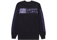The Supreme Saint Sebastian L/S Tee Black is a long-sleeved t-shirt bearing classical branding and Saint Sebastian motifs. This version of the Supreme Saint Sebastian L/S Tee comes in a black colorway, the background color throughout. The front of the shirt is dominated by a portrait of Saint Sebastian in a forest with arrows through his body as people continue to shoot him. This portrait in the top right corner of the shirt is done in purple and white. Under the portrait, the Supreme brand name appears in the gothic text. The rest of the front is taken up by vines and motifs that resemble a paisley pattern. The Supreme brand name also appears up and down the sleeves in purple and black gothic text. The back bears the brand name in the same style as it appears on the sleeves, but bigger. What we like best about this t-shirt is the purple and white vines surrounding the front portrait. This design brings a unique and classic look to the shirt. The Supreme Saint Sebastian L/S Tee Black was released on February 15, 2024, for $54. - Season SS24 - Color Black - Release Date 2024-02-15 - Retail Price 54 - Featured false - Requester Kelsey K - Uploaded By LL