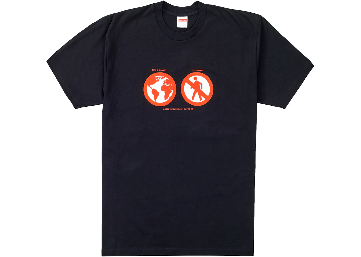 Released as a part of Supreme's Fall/Winter 2019 Week 1 drop, the Supreme Save The Planet tee provided some of Supreme's beloved everpresent political commentary. This tee dropped in seven different colorways and features two side-by-side graphics, one of the earth with the words "Save The Earth" above it and the other featuring a crossed out human that says "Kill Yourself". Below the graphic one can also read the words "1994 The Church Of Supreme". The Supreme Save The Planet Tees released on August 22nd, 2019 and retailed for $38 USD. - Season FW19 - Color Black - Release Date 2019-08-22 - Retail Price 38 - Featured false