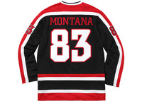 The Supreme Scarface Hockey Jersey Black is a polyester long-sleeved jersey with a Black body accented by combinations of red, white, and Black stripes at the collar, hem, and sleeves. Scarface branding angles down the front of the jersey, accented by a red Supreme script logo label. "83" appears on both sleeves, and the back displays "83" underneath Montana as the player's name. Supreme, the skateboarding and streetwear house, imbues cultural references into their work as expressions of their brand lifestyle. Oliver Stone’s 1983 crime drama Scarface is a favorite reference, from which the brand reinterpreted official imagery from the film and created new references to the film, as displayed in the Scarface Hockey Jersey. Our experts feel that the Scarface Hockey Jersey's best feature is its Montana and 83 branding, which calls out the film’s iconic main character and year of release. The Supreme Scarface Hockey Jersey Black was released on October 12, 2017, and retailed for $198. - Season FW17 - Color Black - Release Date 2017-10-12 - Retail Price 198 - Featured false