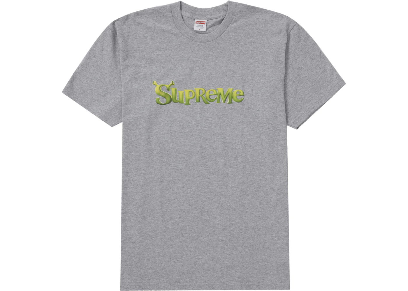 Check out the Supreme Shrek Tee Heather Grey. The NYC-based streetwear and skateboarding brand maintains its time-honored release schedule. Supreme devotees are long accustomed to Supreme's biannual releases. With each release, fans clamor to view the latest tees, which reference everything from high fashion to G-rated animated blockbusters. This is a 100% cotton t-shirt in heathered jersey fabric, done in classic Heather Grey Supreme branding in green gradient text is screen printed on the front, in the style of the DreamWorks animated film Shrek, with Shrek-like details, such as the addition of ears to the Supreme "S." The Supreme red box logo appears on the interior collar label. In our opinion, the best feature of the Heather Grey Shrek Tee is its artwork, which is both offbeat and referential. The Supreme Shrek Tee Heather Grey was released on August 19, 2021, and retailed for a price of $48. - Season FW21 - Color Heather Grey - Release Date 2021-08-19 - Retail Price 48 - Featured false