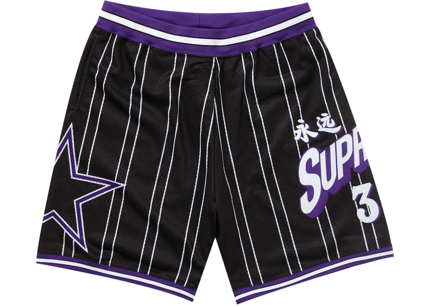 The Supreme Star Basketball Short Black sits at mid-thigh with breathable netting in black, accented by purple lines and a white star applique. There's an elastic waistband with draw cord to customize the fit, while side stripes and a woven Supreme label add an extra level of flair. The Black Star Basketball Shorts by Supreme features a 100% polyester net designed for optimal airflow. There's an interior draw cord that threads through metal eyelets. There are dual side pockets and an embroidered star at the left hem. The shorts feature a purple and white waistband and purple and white leg bands with white stripes, and "Supreme 32" is printed in purple and white below Chinese characters. One feature we love about the Supreme Star Basketball Short Black is the silicone-grip inner waistband, which holds shirts in place during movement, as well as the laser-cut vents at the back hem for added airflow. The pair retailed at $118 when they were released on June 13, 2024. - Season SS24 - Color Black - Release Date 2024-06-13 - Retail Price 118 - Featured false - Requester Kelsey K - Uploaded By LL