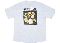 The Supreme Still Life Tee Ash Grey displays an artistic version of the still life genre with a bowl full of peaches and some burst-open fruits in the foreground. The stylish design of the Supreme Still Life Tee features a ribbed collar with a branded tag on the back. The t-shirt features a neutral grey colorway. Most of its branding and contrasts appear on the chest area. Black accents arise from "SUPREME" writing. Below it, a multicolor still-life imprint takes center stage. The rest of the material is plain, elegantly displaying the neutral grey tones. The cuffs on the short sleeves of this t-shirt fold inwards for fortification to match the hem. What outstanding features adorn the Supreme Still Life Tee Ash Grey? Our experts adore the still-life artwork covering the chest. Its colorful design delivers a touch of streetwear to a classic plain tee. The t-shirt was priced at $36 when released on August 20th, 2018. - Season FW18 - Color Ash Grey - Release Date 2018-08-20 - Retail Price 36 - Featured false