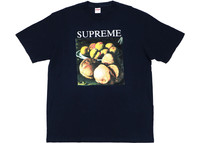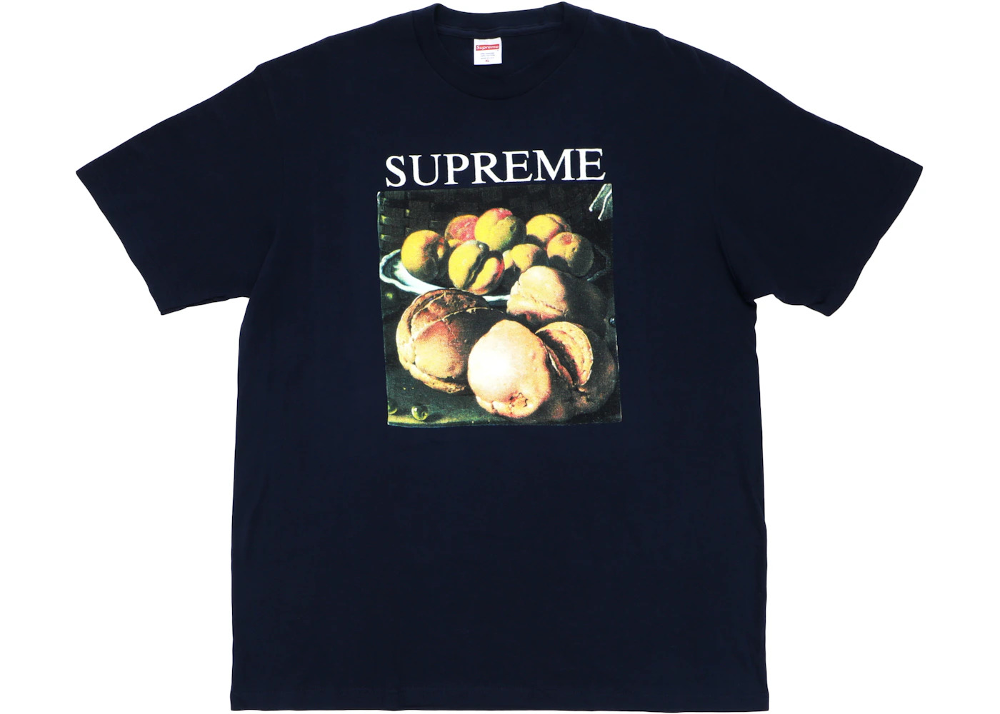 The Supreme Still Life Tee Navy spices a classic t-shirt in a monochrome colorway with an artistic photograph adopted from the Still Life painting genre. A white neck label appears on the rib knit crewneck of the Supreme Still Life Tee. It displays a red box log of the Supreme brand. Further, it informs that 100% pre-shrunk cotton was used to make this tee. The primary colorway of this t-shirt is a neutral navy color. Its only accents come from a Still Life artwork imprint on the front. The chest area features a green-themed photo showing several peaches. Some of the fruits in the foreground are light-struck and burst open. The background displays more peaches resting on a white bowl. Above the screen-printed pictures is the name Supreme in white, large, black letters. We love the Still Life image on the front that adds an artistic vibe to the t-shirt. The Supreme Still Life Tee Navy was released on August 20th, 2018, for $36. - Season FW18 - Color Navy - Release Date 2018-08-20 - Retail Price 36 - Featured false