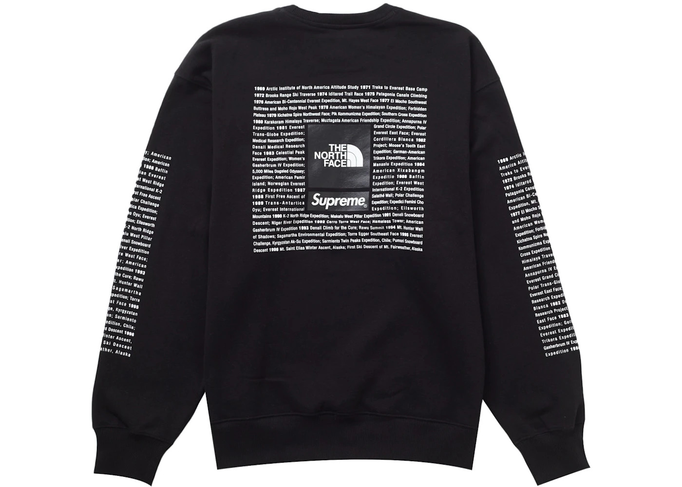 The Supreme The North Face Crewneck Black is a sweatshirt designed as a collaboration between Supreme and the activewear brand. This iteration of the Supreme The North Face Crewneck appears in a black colorway. On the front of the sweatshirt, you’ll find a The North Face logo patch on one side of the chest with the Supreme logo box underneath. On the back, you’ll also find The North Face logo patch right above the Supreme logo box, but in this case, they are both housed in the middle of a block of printed white text. The white text bears the years and names of famous outdoor expeditions from 1969 to 1996. This same text appears in columns down each sleeve of the sweatshirt. Our favorite feature of this sweatshirt is the simple text style stating the years of the expeditions. It adds a simple yet unique touch to the design. The Supreme The North Face Crewneck Black was first released on February 29, 2024, for a price of $138. - Season SS24 - Color Black - Release Date 2024-02-29 - Retail Price 138 - Featured false - Requester Kelsey K - Uploaded By LL