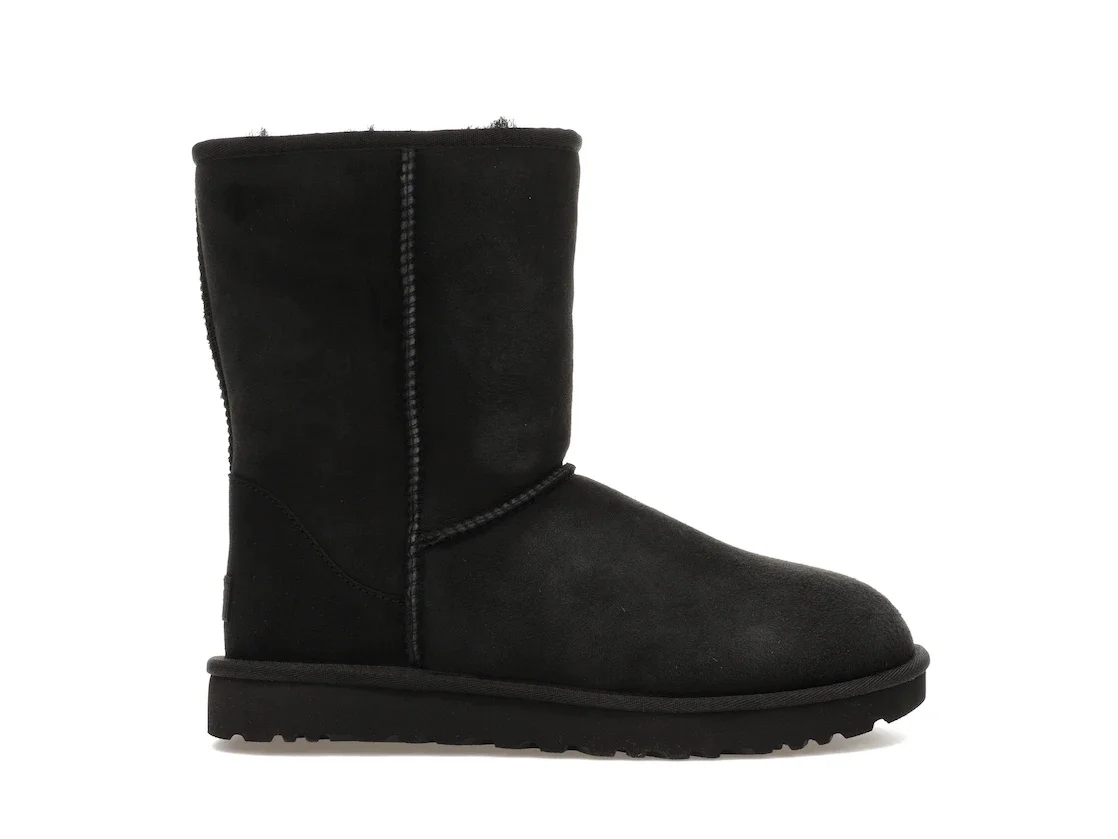 The UGG Classic Short II Boot Black (Women's) combines a vintage look with black suede uppers and comfort afforded by sheepskin lining. This Classic Short II Boot sits on the UGG Treadlite EVA sole made for lightweight footwear. A piping sits between the shoe and the midsole. These women’s shoes come in a one-piece construction, with the upper and quarter panels merging. However, the shoe has a visible polyester binding, most notably on the tongue border and on the side seam. There is also a binding running down the shaft to the sole. On the counter is a leather sticker embossed with a UGG branding. The sheepskin lining is slightly visible from the exterior. It covers the shaft to meet a wooly insole. What UGG Classic Short II Boot Black (Women's) features make it stand out? We love the solid construction of this shoe, including the topical pre-treated upper, which is stain and water-resistant. Released on February 1st, 2022, this shoe had a price of $170. - Style 1016223-BLK - Colorway Black - Retail Price 170 - Release Date 2022-02-01 - Featured false