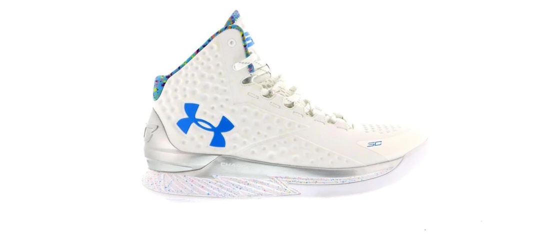 The Under Armour Curry One "Splash Party" made its debut after Stephen Curry turned 27 years old. Originally, the story of the "Splash Party" Curry One began as an exclusive made especially for Steph’s 27th birthday in March of 2015. Release or not, there is no denying that the white colorway that featured a confetti inspired multi-colored inner lining and midsole speckles, along with chromed out TPU heel counter and blue accents, was one of the most popular Curry One colorways amongst sneakerheads. After Curry was seen playing in the Splash Party Curry One a few times, it was rumored that a release would make the thought-to-be player exclusive available to fans. Then Steph laced up the Splash Party Curry One in Game 5 of the NBA Finals, solidifying the need for Warriors fans and sneaker collectors to have a pair. The Curry One Splash Party released as a part of the "Championship" Curry One pack in October of 2015 in extremely limited quantities and then UA followed up in November with a release of the Splash Party Curry on its own in November. Despite the months of anticipation and questioning, and multiple releases, the Under Armour Curry One "Splash Party" remained one of the most popular Curry One colorways amongst sneaker enthusiasts. - Style 1286288-100 - Colorway White/Metallic Silver-Blue - Retail Price 120 - Release Date 2015-11-03 - Featured false - Product Line Under Armour Curry
