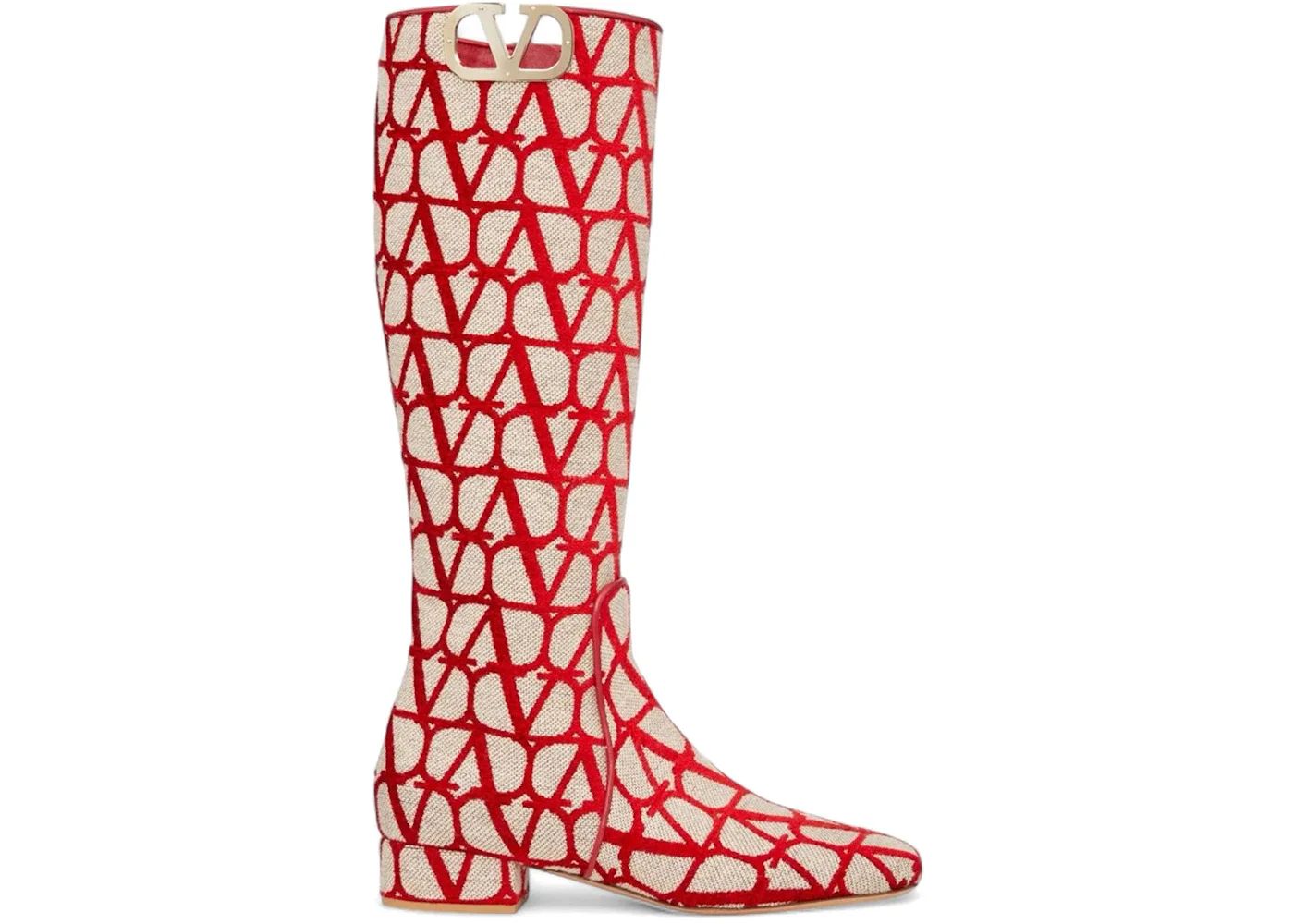 Valentino Toile Iconographe Calfskin V'logo High Knee High Boots Beige Red (Women's)