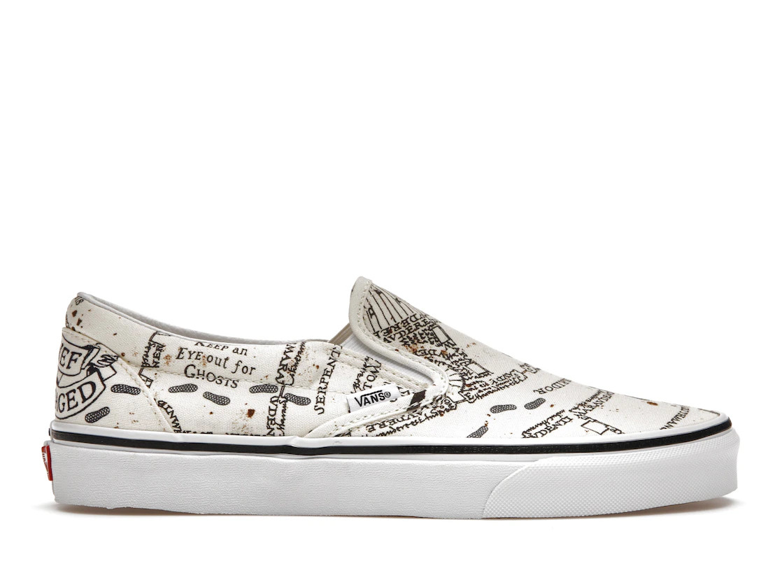 The Vans Slip On Harry Potter Marauders Map is a special iteration of the Vans slip-on shoes, released as part of a collaboration with the Harry Potter Film, and taking inspiration from the Marauders Map. The shoes have a cream upper made from canvas material with elastic side accents for easy slip-on and off. The cream upper is complemented by a Marauders Map theme which covers the entire upper with intrinsic details from the original map including the Hogwarts layout, magical footprints, and phrases like "keep an eye out for ghosts." The Vans Slip On shoes retain Vans branding with the iconic red Off the Wall bumper logo. What our experts think stands out the most on these Vans Slip On Harry Potter Marauders Map is the rubber sole unit. It is extra thick to provide an added layer of cushioning and boasts a waffle-pattern outsole to provide optimum grip and traction on various surfaces. The shoes were first released retailing at $65 on June 7, 2019. - Colorway Marauders Map/Classic White - Retail Price 65 - Release Date 2019-06-07 - Featured false