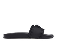 With the Versace Palazzo Slides Black, you can experience a classic pool slider made in Italy. This shoe is crafted in a stealthy colorway that features three-dimensional details. The Black Versace Palazzo Slides are composed of black rubber. This luxurious footwear features a molded footbed contoured for comfort and lined with a textured insole. The upper is a wide strap that arches over the midfoot for both style and ease of wear. The rubber midsole, designed for cushioning, is in a slightly lighter shade of black and features embossed Versace branding on the heel. The jet black rubber outsole that also features embossed Versace branding is grooved for non-slip grip at the poolside and dotted with specs of silvery white. What we enjoy most about this high-end slide-on sandal is the three-dimensional detailing on the upper. A Medusa's head adorns the center of this upper, while Greco detailing borders the edges. The Versace Palazzo Slides Black debuted on December 3, 2021, for an original retail price of $295. - Style DSU5883-DGO9G_D41 - Colorway Black - Retail Price 295 - Release Date 2021-12-03 - Featured false