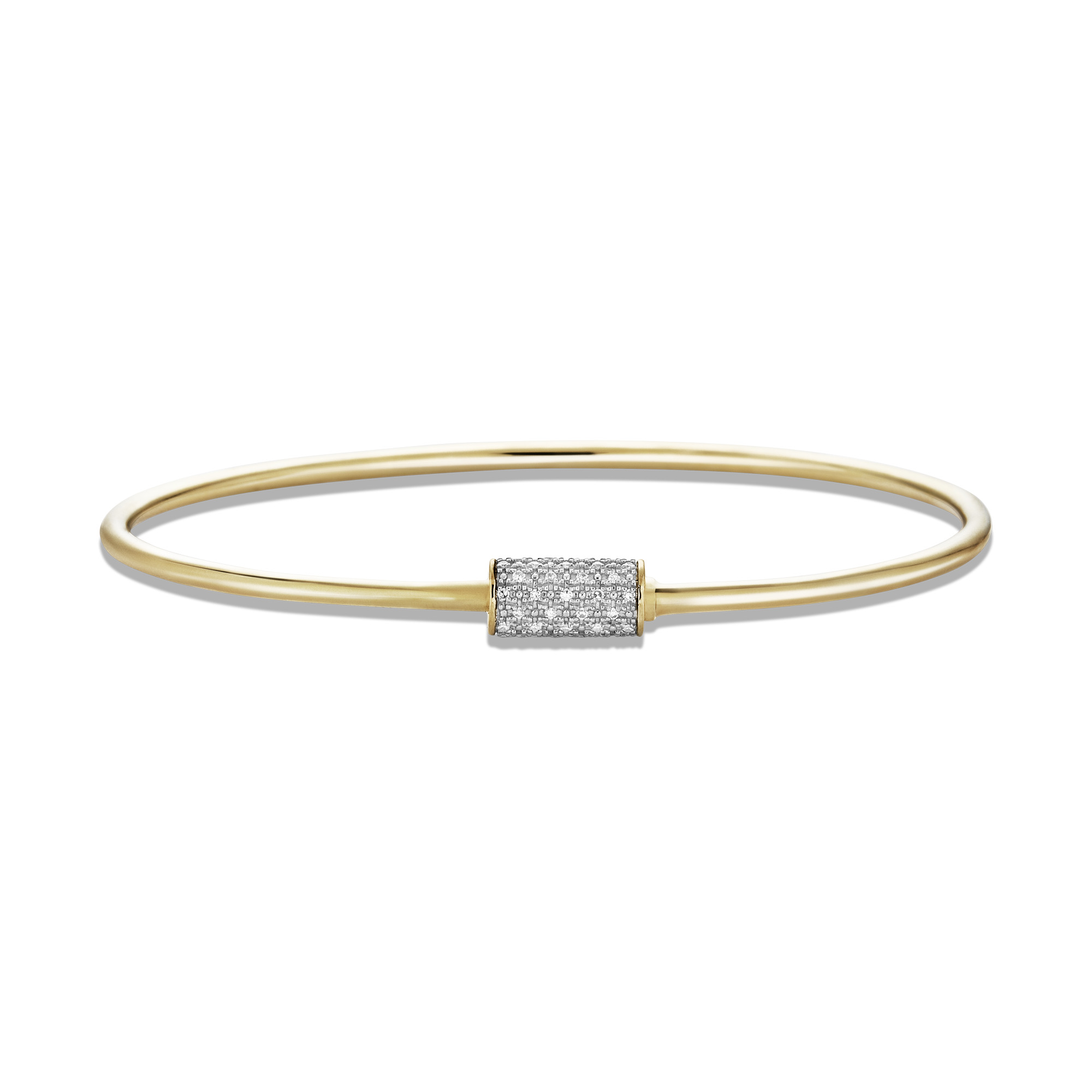 - Natural white diamonds: 0.14 CTW (approx) - Pave lock length: 10mm - Bracelet width: 2.3mm - Threaded Lock - 10K Solid yellow gold Additional Information It's hard to resist the sparkly spread of pave diamonds, nestled together side by side. Our pieces are hand-set under a microscope, meaning that even the smallest details get our full attention. Every diamond counts. Still, our ultimate goal when making jewelry is to give you the best value, which means conflict-free diamonds and solid gold, and a price that is fair. We believe that you can't ever go wrong with more sparkle, so we do our best to give you everything you deserve.
