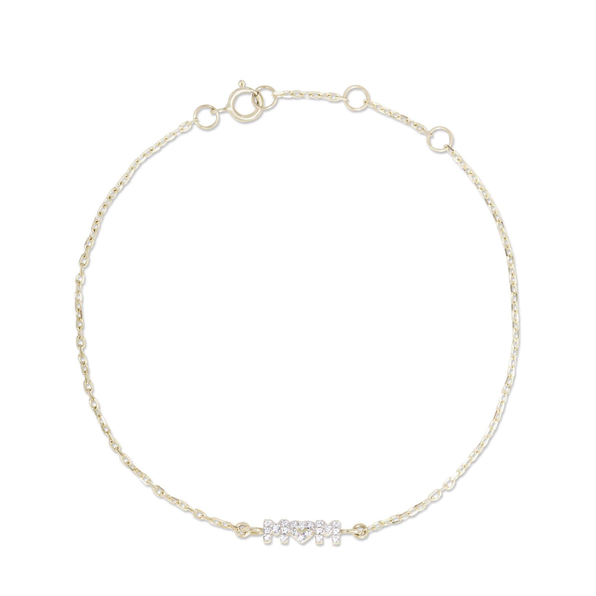 - Spring ring clasp - "MOM" size: 10x3mm - Adjustable chain length: 6"-7" - Ethically sourced materials and conflict free diamonds - Natural pave white diamond: 0.05CTW (approx) - 10K Solid yellow gold - Fully compliant with The Kimberley Process Additional Information It's hard to resist the sparkly spread of pave diamonds, nestled together side by side. Our pieces are hand-set under a microscope, meaning that even the smallest details get our full attention. Every diamond counts. Still, our ultimate goal when making jewelry is to give you the best value, which means conflict-free diamonds and solid gold, and a price that is fair. We believe that you can't ever go wrong with more sparkle, so we do our best to give you everything you deserve.