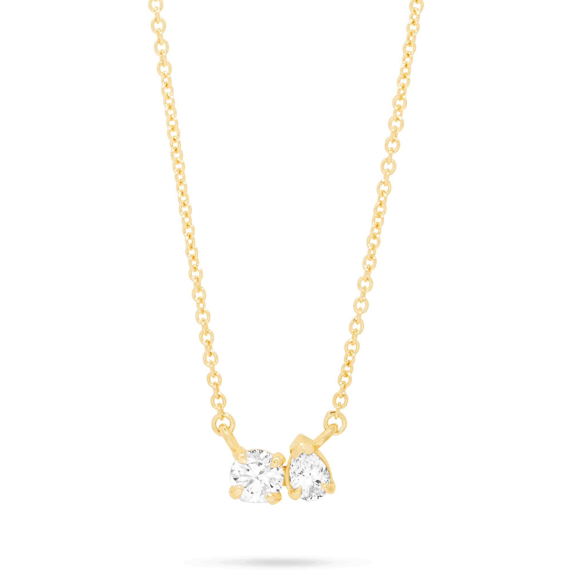- 14K Solid yellow gold - Approx 0.4CTW - Jubilee size: 7.5 x 4.5mm - Quality/Color: EF VS / FG VS2 - White Lab-Created Round Diamond - White Lab-Created Pear Diamond - Chain length: 16"-18" - Part of our Rathe™ collection