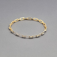 - Ethically sourced materials and conflict-free diamonds - Fold-over clasp - All carat weights are approximate - Fully compliant with The Kimberley Process - Hand selected natural single cut diamonds Stones Total Weight (CTW): 0.6ct (approx) Stone Type: Natural White Diamonds Color: GH Clarity: SI Metals Metal Type: Gold (with white rhodium plating) Metal Color: Yellow Gold Metal Finish: High Polish Gold Karat: 14K Dimensions Width: 4.3mm Length: 7" Additional Information It's hard to resist the sparkly spread of pave diamonds, nestled together side by side. Our pieces are hand-set under a microscope, meaning that even the smallest details get our full attention. Every diamond counts. Still, our ultimate goal when making jewelry is to give you the best value, which means conflict-free diamonds and solid gold, and a price that is fair. We believe that you can't ever go wrong with more sparkle, so we do our best to give you everything you deserve.