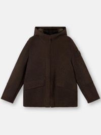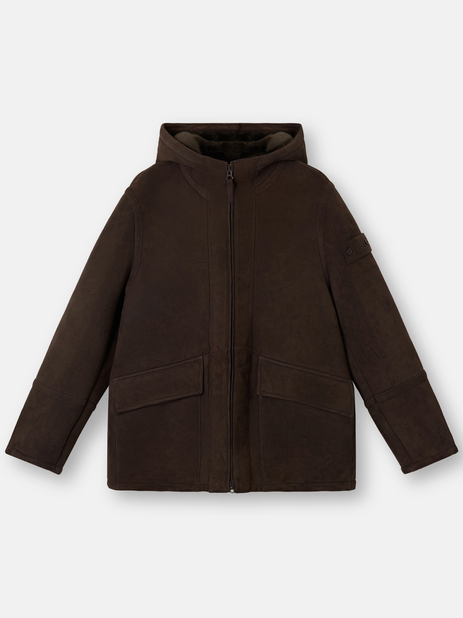 Hooded jacket in suede sheepskin with smooth interior, hand pockets with concealed snaps, and two-way zipper fastening. Treated with anti-drop agent. FABRIC RESEARCH AND TREATMENT Ghost pieces, derived from the concept of camouflage, are totally monochromatic. Even the Stone Island badge is created in a special monocolor version to blend in with the garment. Hooded jacket made of suede sheepskin, treated with an anti-drop agent. The inner hair is treated to achieve a smooth appearance. STYLE AND FIT Hood with snap on back to fasten down slightly. Slanting hand pockets with flaps and concealed snaps. Stone Island Ghost badge on left sleeve. Two-way zipper fastening. COMPOSITION AND CARE Sheepskin Fur Origin: United Kingdom Dyed Real Fur. Contains Non-textile Parts Of Animal Origin