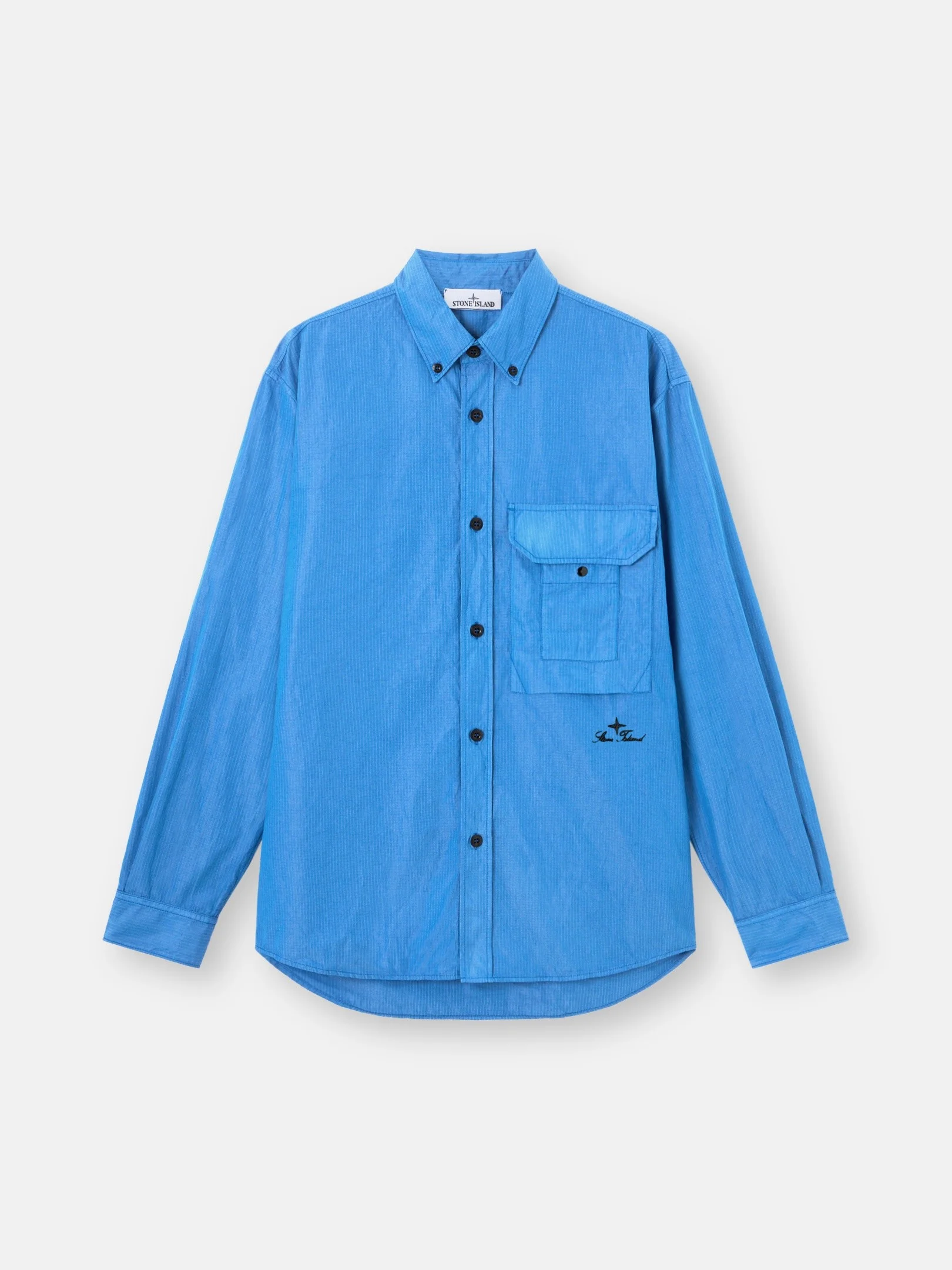 Long-sleeve shirt in lightweight cotton-nylon ripstop, featuring a button-down collar, dual chest pocket, logo embroidery, and a curved hem. Garment dyed. FABRIC RESEARCH AND TREATMENT Long-sleeve shirt made from a lightweight cotton and nylon ripstop. Garment dyed. The nylon component of the fabric does not absorb the dye but is altered by the cotton dye bath. STYLE AND FIT Button-down collar. Bellows chest pocket with flap and concealed snap, and smaller overlapping pocket with snap. Stone Island logo script embroidery on lower front left. Buttoned cuffs and sleeve placket. Back yoke with tape loop and snap. Curved dropped back hem. Button fastening. Comfort fit. COMPOSITION AND CARE 79% Cotton 21% Polyamide / Nylon