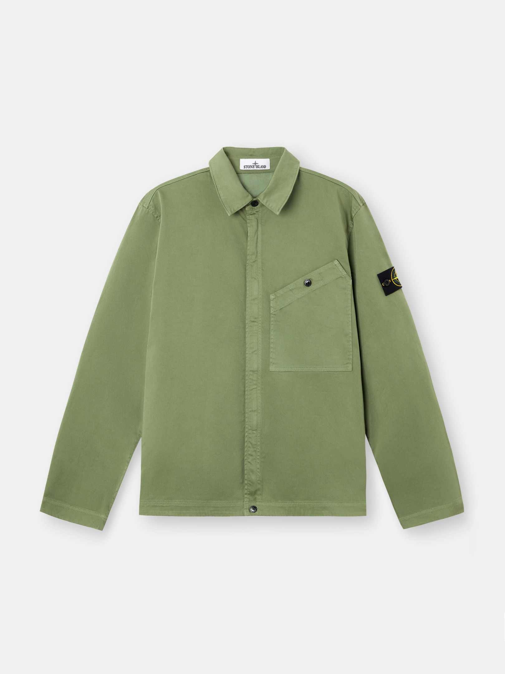 Overshirt in organic stretch cotton satin, featuring a chest pocket with diagonal opening, adjustable snap cuffs, and hidden two-way zipper fastening. Garment dyed. FABRIC RESEARCH AND TREATMENT Overshirt in organic stretch cotton satin. Garment dyed. STYLE AND FIT One chest patch pocket on left side with diagonal entrance and snap. Stone Island badge on left sleeve. Tightening snaps at cuffs. Back yoke. Two-way zipper fastening under placket with snaps at bottom hem and collar. Regular fit. COMPOSITION AND CARE 98% Cotton 2% Elastane / Spandex