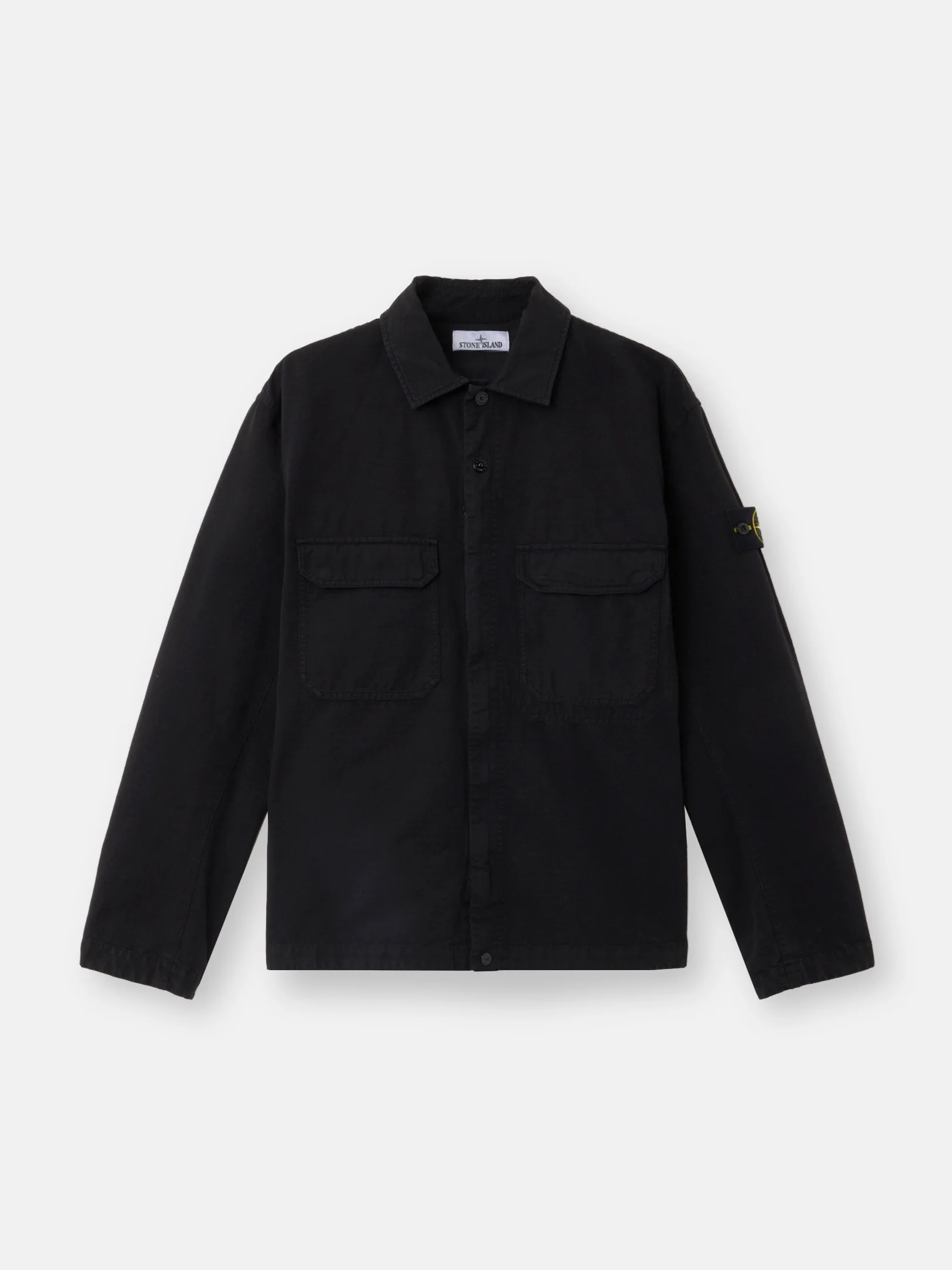 Overshirt in organic cotton ripstop featuring chest pockets with snap, adjustable snap cuffs, and a hidden two-way zipper fastening with snaps. Garment dyed. FABRIC RESEARCH AND TREATMENT Overshirt in organic cotton ripstop. Garment dyed. STYLE AND FIT Chest patch pockets with two snaps under flap. Stone Island badge on left sleeve. Tightening snap at cuffs. Back yoke. Two-way zipper fastening up to the chest, hidden under a placket with one snap on bottom and two on upper chest. Comfort fit. COMPOSITION AND CARE Garment: 100% Cotton. Lining: 100% Cotton