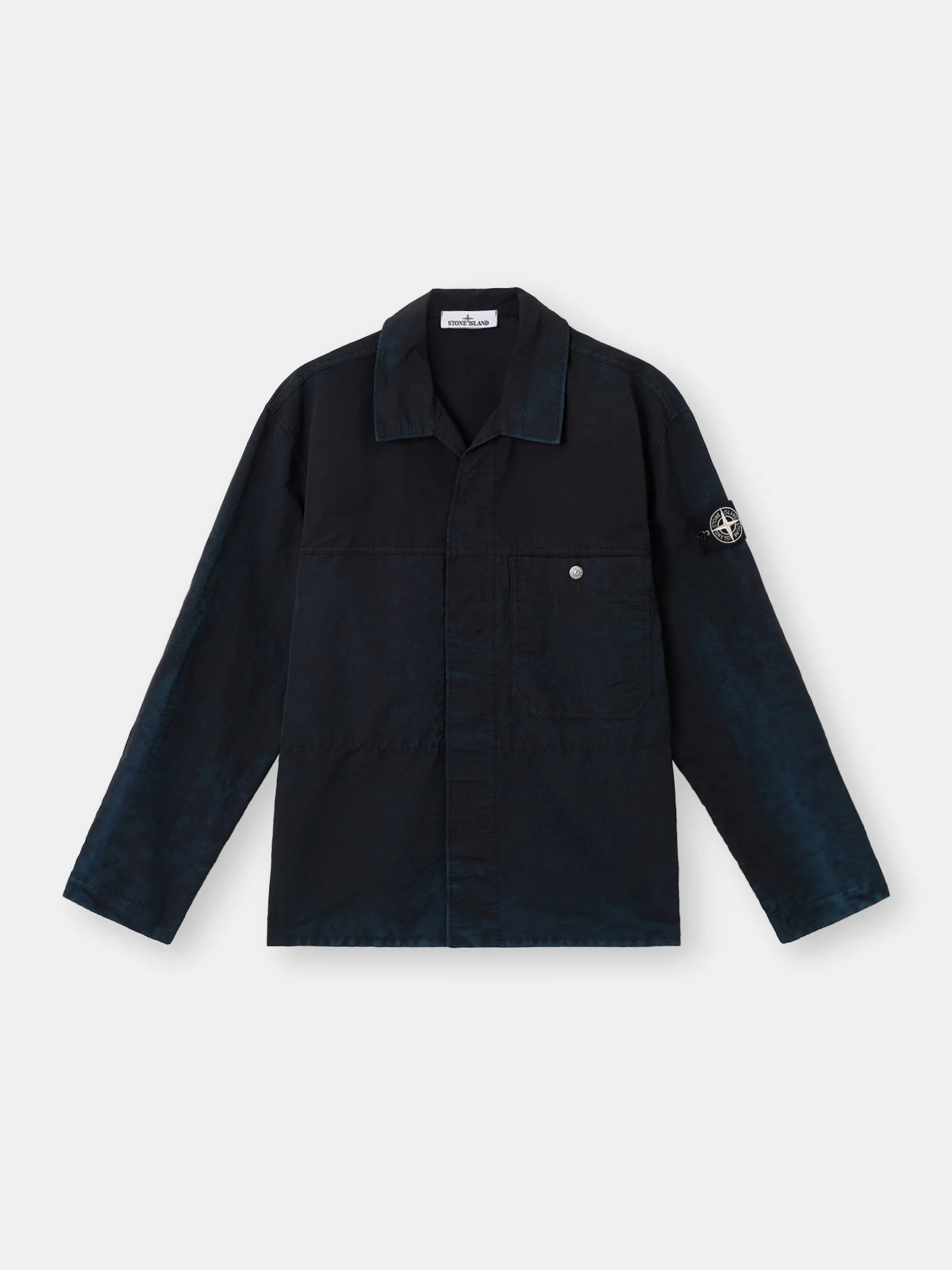 Overshirt in abrasion-resistant nylon with chest pocket, double placket, and button fastening. Garment dyed with an innovative corrosion treatment that makes each piece unique. FABRIC RESEARCH AND TREATMENT Overshirt made from a fabric composed of mechanically spun recycled nylon fibers that are resistant to wear and abrasion. During the spinning process, the nylon filaments are steamed to achieve a feel closer to organic fibers. Garment dyed with carefully selected dyes, then faded through an innovative corrosion treatment, reflecting Stone Island's ongoing commitment to research and experimentation. The corroded areas, particularly where the fabric is thicker, take on varied colors due to the irregularity of the treatment, creating a slightly worn effect and making each piece unique. STYLE AND FIT One patch pocket on left chest with snap. Two internal pockets. White Stone Island fabric research badge on left sleeve. Tightening snap at cuffs. Button fastening inside double placket. Comfort fit. COMPOSITION AND CARE 100% Polyamide / Nylon