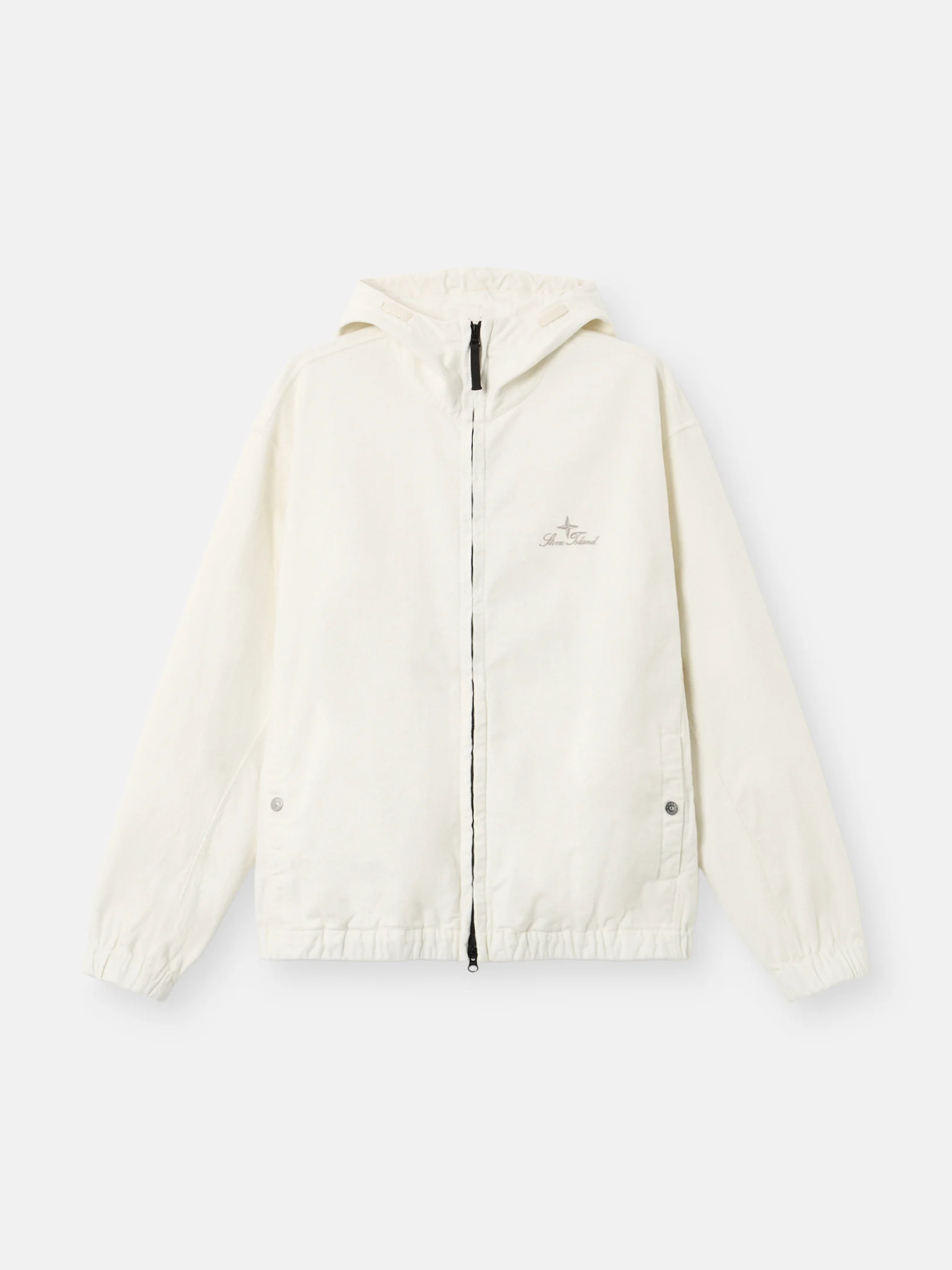 Hooded zipper-up shirt in stretch cotton moleskin, featuring an archival Stone Island logo, drawstring hood, pockets, and a high-neck two-way zipper fastening. Garment dyed. FABRIC RESEARCH AND TREATMENT Hooded zipper-up shirt in stretch cotton moleskin. Garment dyed. STYLE AND FIT Shaped drawstring hood. Embroidered archival Stone Island logo at chest. Standing hand pockets with snap. Elasticated cuffs and hem. High-neck two-way zipper fastening. Regular fit. COMPOSITION AND CARE Garment: 97% Cotton 3% Elastane / Spandex. Lining: 100% Cotton