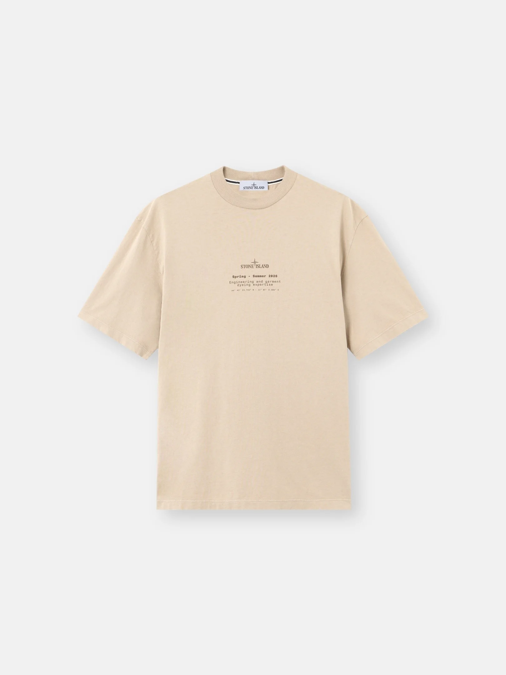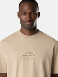 Short-sleeve T-shirt in organic cotton jersey, featuring a logo and text print on the chest and a large Compass motif with aged effect on the back. Garment dyed. FABRIC RESEARCH AND TREATMENT Short-sleeve T-shirt in organic cotton jersey with “Stone” print. Garment dyed. STYLE AND FIT Ribbed neckline. Print on chest with Stone Island logo and text. Large Compass logo print with aged effect and text on back. COMPOSITION AND CARE Garment: 100% Cotton Ribbing: 100% Cotton