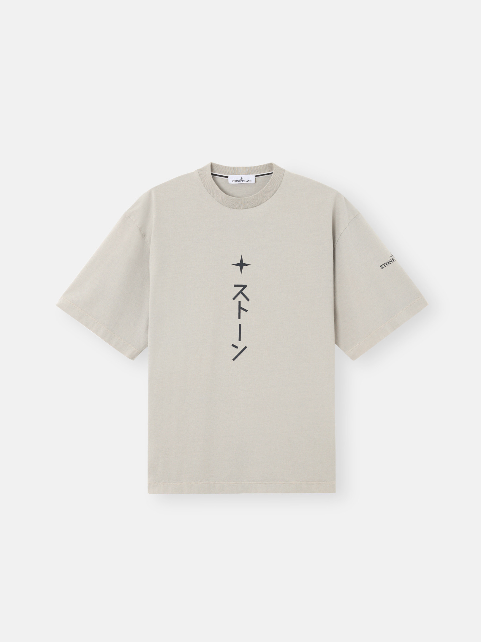 Short-sleeve T-shirt in combed organic cotton jersey with print featuring the Stone Island star and Japanese characters on the chest and back. Garment dyed. FABRIC RESEARCH AND TREATMENT Short-sleeve T-shirt in combed organic cotton jersey with ‘Island’ print. Garment dyed. STYLE AND FIT Ribbed neckline. Print of Stone Island star and Japanese characters on chest. Stone Island logo print on left sleeve. Large print of island and Japanese characters on back. Regular fit. COMPOSITION AND CARE Garment: 100% Cotton. Ribbing: 100% Cotton