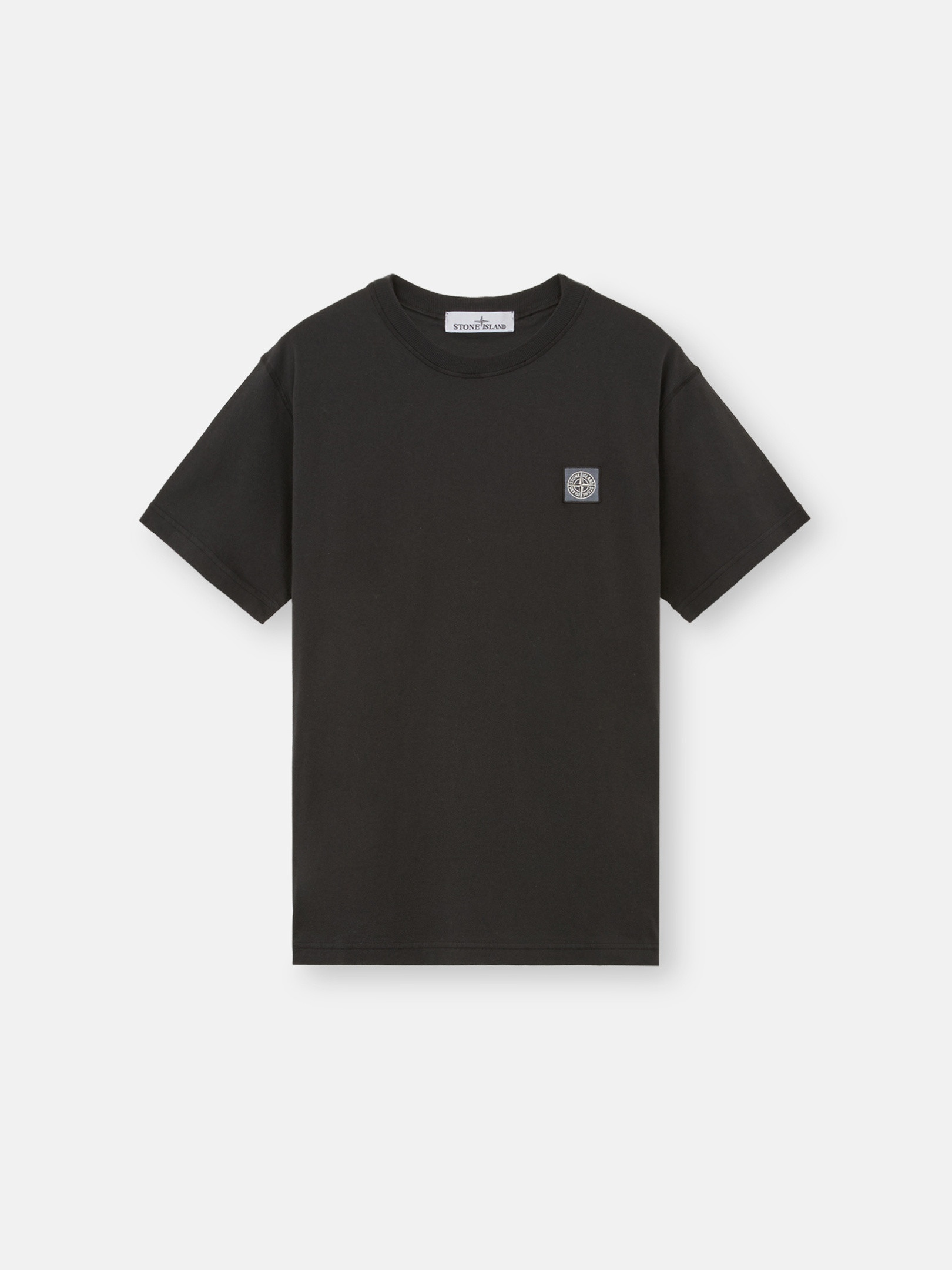 Short-sleeve T-shirt in organic cotton jersey, featuring a Compass logo patch on the chest, overlock seams, and lunette detail on the back. Garment dyed with the 'Fissato' effect. FABRIC RESEARCH AND TREATMENT Short-sleeve T-shirt in organic cotton jersey. Garment dyed and treated with the ‘Fissato’ effect, a water-soluble resin treatment process and garment dyeing technique creating a three-dimensional appearance. STYLE AND FIT Ribbed neckline. Stone Island Compass logo patch on chest. Overlock seams. Lunette under back neckline with inner lining. Slim fit. COMPOSITION AND CARE Garment: 100% Cotton. Ribbing: 100% Cotton
