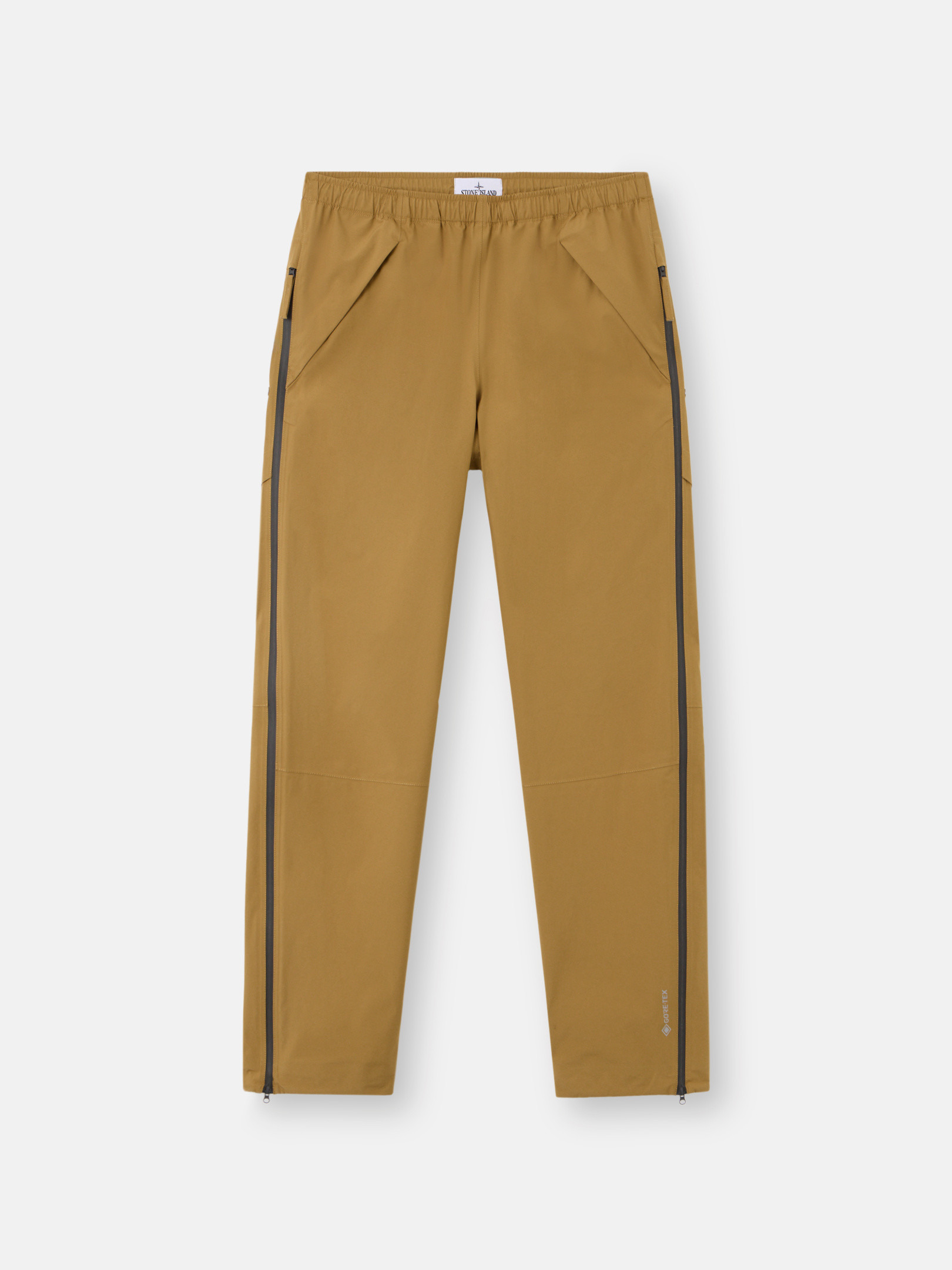 Pants in performance GORE-TEX fabric made from BIONIC poly canvas, featuring heat-taped seams, two-way zippers along legs, and elasticated waistband. Breathable, waterproof, and windproof. FABRIC RESEARCH AND TREATMENT Pants made with performance GORE-TEX fabric, exhibiting the black diamond label reserved for high-performance pieces. The outer face of the fabric is made from a BIONIC polyester canvas. It is bonded to the thin GORE-TEX membrane and an inner protective mesh in polyester that has been solution-dyed before the yarn extrusion. The laminated fabric, subjected to rigorous testing to ensure compliance with GORE-TEX’s stringent quality and durability standards, is extremely breathable, durably waterproof, and completely windproof. STYLE AND FIT Diagonal hand pockets with fixed flap and waterproof zipper. On the back of each leg, eyelets under small fixed flap. Two-way zipper along entire outer leg and internal snap placket with one snap featuring Stone Island star. Drawcord in cuffs with internal loop to hold it in place. Elasticated waistband with internal drawcord. Heat-taped seams. Loose fit. COMPOSITION AND CARE Outer Layer: 100% Polyester - Excluding The Coating. Inner Layer: 100% Polyester