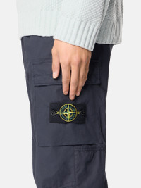 Cargo pants in light stretch cotton tela, featuring zipper hand pockets, cargo flap pockets, a back snap pocket, elasticated cuffs, and an elasticated drawstring waistband. Garment dyed. FABRIC RESEARCH AND TREATMENT Pants in light stretch cotton tela. Garment dyed. STYLE AND FIT Vertical hand pockets with concealed zipper. Bellows cargo pockets with flap and concealed dual snap. Stone Island badge on left cargo pocket. Back pocket with fixed flap and concealed snap. Shaped knees. Elasticated tape cuffs. Elasticated waistband with internal drawstring. Zipper fly. Regular tapered fit. COMPOSITION AND CARE 97% Cotton 3% Elastane / Spandex