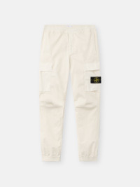Cargo pants in stretch organic cotton twill, featuring multiple pockets, elasticated cuffs, and an elasticated drawstring waistband. Garment dyed. FABRIC RESEARCH AND TREATMENT Pants in stretch organic cotton twill. Garment dyed. STYLE AND FIT Vertical hand pockets with concealed zipper. Bellows cargo pockets with flap and concealed dual snap. Stone Island badge on left cargo pocket. Back pocket with fixed flap and concealed snap. Shaped knees. Elasticated tape cuffs. Elasticated waistband with internal drawstring. Zipper fly. Regular tapered fit. COMPOSITION AND CARE 97% Cotton 3% Elastane / Spandex