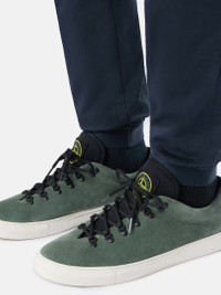 Cargo pants in stretch organic cotton and wool satin, featuring multiple pockets, elasticated cuffs, and an elasticated drawstring waistband. Garment dyed. FABRIC RESEARCH AND TREATMENT Cargo pants in stretch organic cotton and wool satin. Garment dyed. STYLE AND FIT Standing hand pockets with hidden zipper. One back pocket with hidden snap under fixed flap. Bellows flap pocket on each leg with two snaps hidden under flap; left pocket features Stone Island badge. Shaped knees. Elasticated band at cuffs. Elasticated waistband with inner drawstring. Zipper fly. Regular tapered fit. COMPOSITION AND CARE 93% Cotton 5% Wool 2% Elastane / Spandex