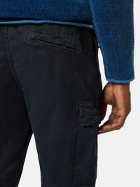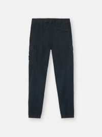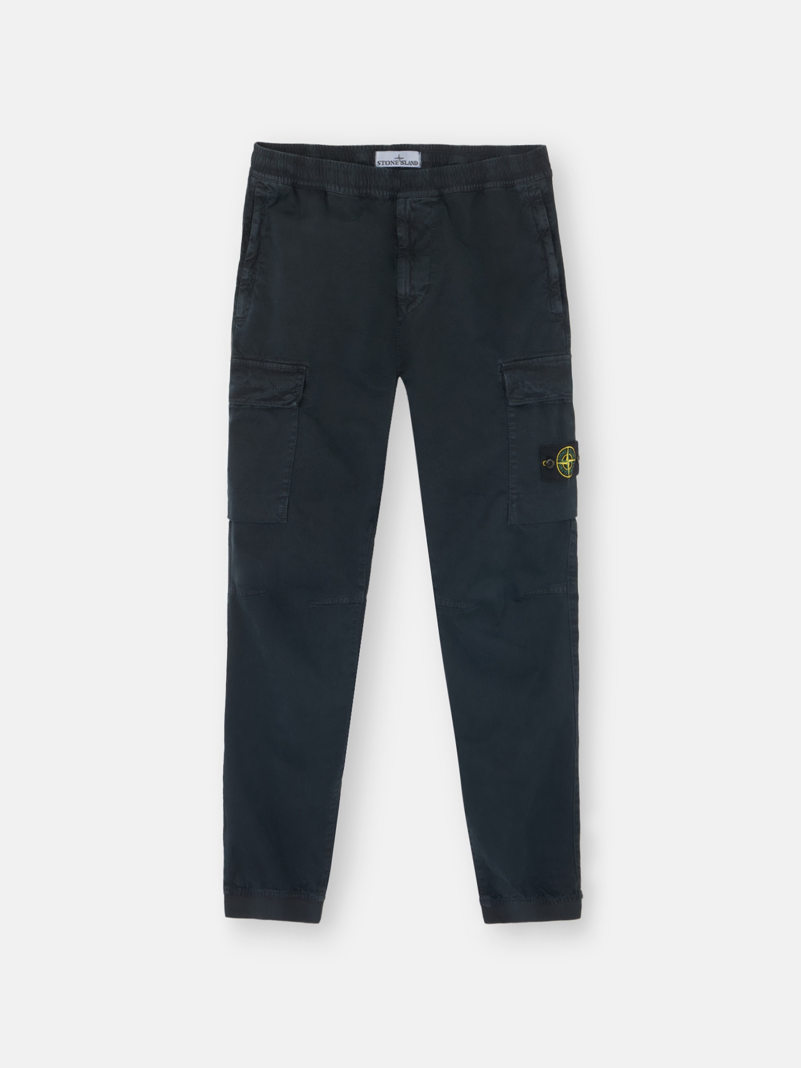 Cargo pants in stretch organic broken twill cotton, featuring elasticated cuffs and an elasticated drawstring waistband. Garment dyed with the 'OLD' treatment for a slightly worn appearance. FABRIC RESEARCH AND TREATMENT Cargo pants in stretch organic broken twill cotton. Garment dyed with the 'OLD' treatment, an exclusive dyeing treatment and subsequent fading on the finished garment for a slightly worn and three-dimensional appearance. STYLE AND FIT Standing hand pockets with hidden zipper. One back pocket with hidden snap under fixed flap. Bellows flap pocket on each leg with two snaps hidden under flap; left pocket features Stone Island badge. Shaped knees. Elasticated band at cuffs. Elasticated waistband with inner drawstring. Zipper fly. Regular tapered fit. COMPOSITION AND CARE 97% Cotton 3% Elastane / Spandex