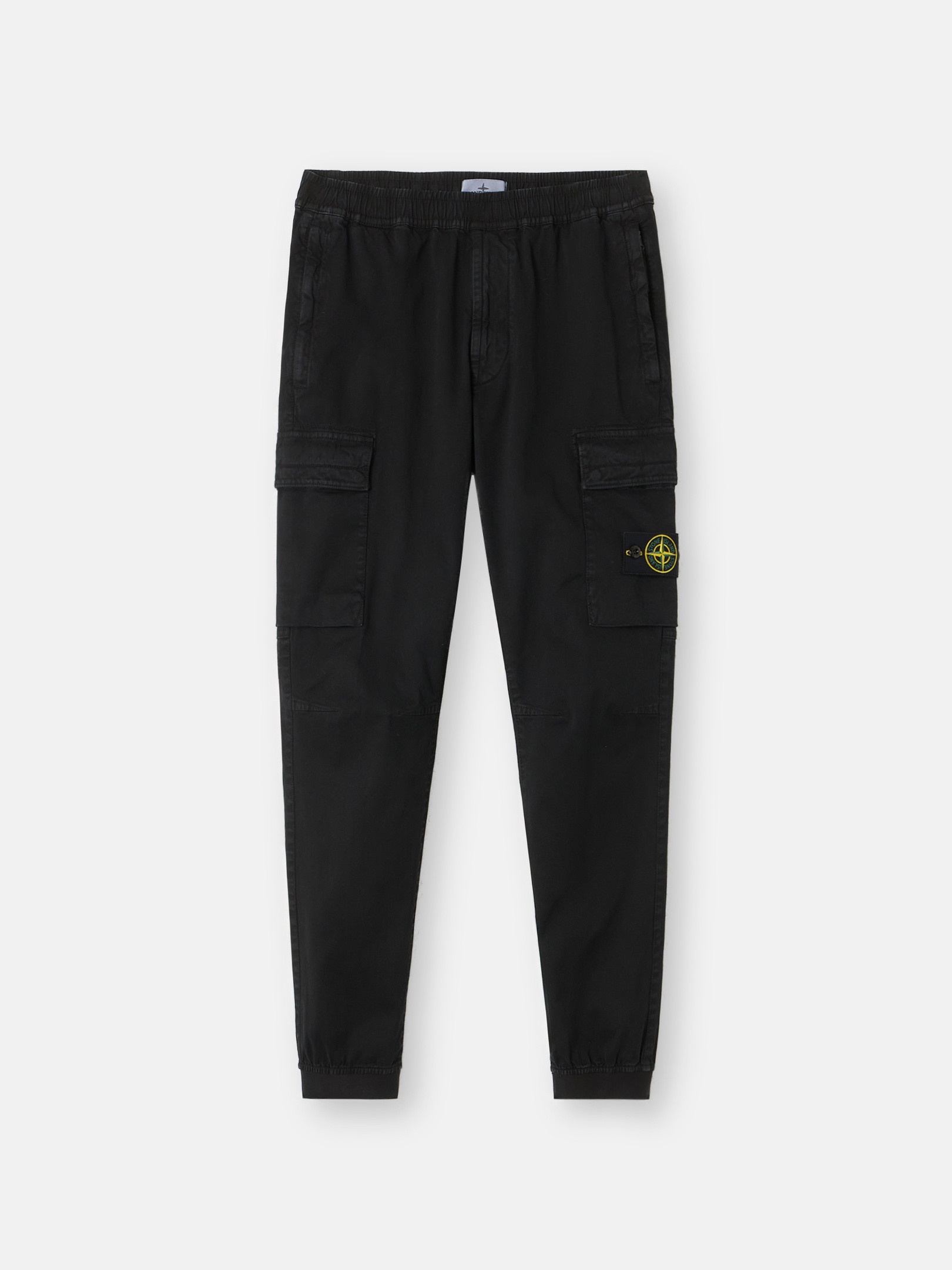 Cargo pants in stretch organic broken twill cotton, featuring elasticated cuffs and an elasticated drawstring waistband. Garment dyed with the 'OLD' treatment for a slightly worn appearance. FABRIC RESEARCH AND TREATMENT Cargo pants in stretch organic broken twill cotton. Garment dyed with the 'OLD' treatment, an exclusive dyeing treatment and subsequent fading on the finished garment for a slightly worn and three-dimensional appearance. STYLE AND FIT Standing hand pockets with hidden zipper. One back pocket with hidden snap under fixed flap. Bellows flap pocket on each leg with two snaps hidden under flap; left pocket features Stone Island badge. Shaped knees. Elasticated band at cuffs. Elasticated waistband with inner drawstring. Zipper fly. Regular tapered fit. COMPOSITION AND CARE 97% Cotton 3% Elastane / Spandex