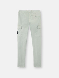 Cargo chino pants in organic cotton stretch broken twill, featuring flat cargo pockets and asymmetrical seams. Garment dyed with the “OLD” treatment for a slightly worn appearance. FABRIC RESEARCH AND TREATMENT Cargo chino pants in organic cotton broken twill with stretch. Garment dyed with the “OLD” treatment, an exclusive dyeing treatment and subsequent fading on the finished garment for a slightly worn and three-dimensional appearance. STYLE AND FIT Angled hand pockets. Flat cargo pockets with angled flap and concealed double snap. Back pocket with fixed flap and concealed snap. Stone Island badge on left leg. Shaped knees. Asymmetrical seam construction. Reinforced inner waistband with contrast lining. Zipper fly and button fastening. Skinny fit. COMPOSITION AND CARE 98% Cotton 2% Elastane / Spandex