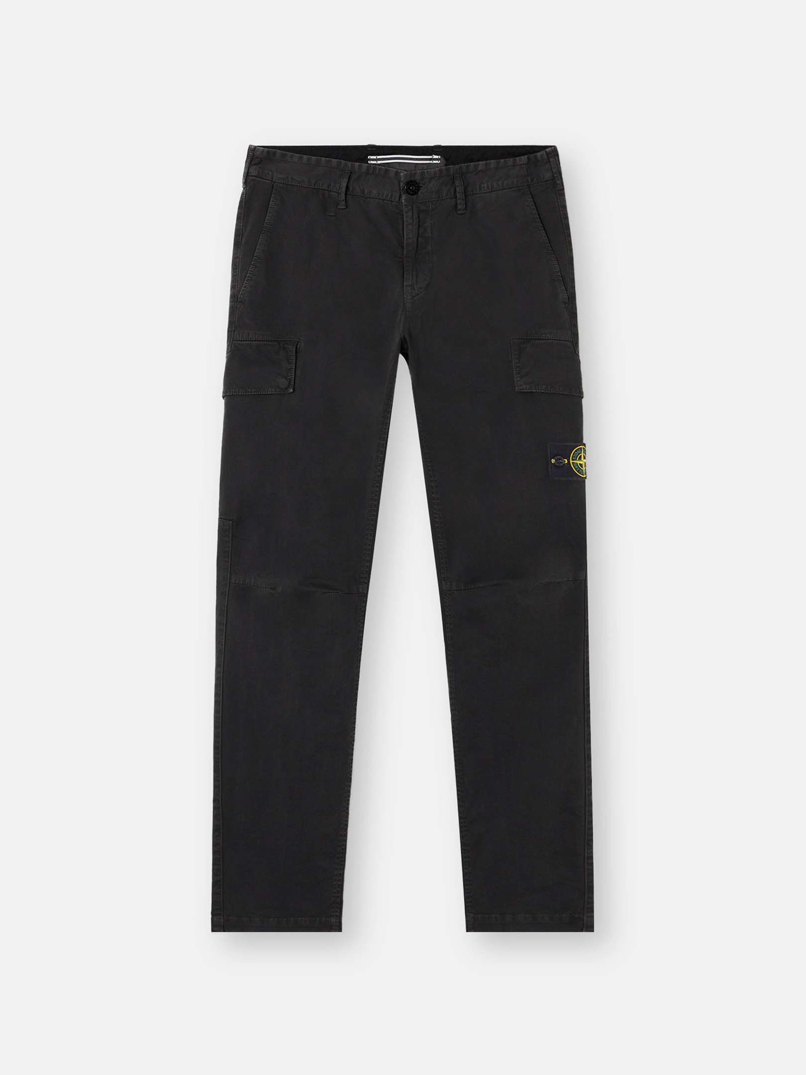 Cargo pants in stretch organic broken twill cotton featuring a slightly worn appearance, and multiple pockets with snap fastening. Garment dyed. FABRIC RESEARCH AND TREATMENT Cargo pants in stretch organic broken twill cotton. Garment dyed with the 'OLD' treatment, an exclusive dyeing treatment and subsequent fading on the finished garment for a slightly worn and three-dimensional appearance. STYLE AND FIT Slanted hand pockets. One back slit pocket with hidden snap fastening. Pocket on legs featuring a flap with indent seam and hidden two-snap fastening; the left pocket features the Stone Island badge. Zipper and button fly. Skinny fit. COMPOSITION AND CARE 98% Cotton 2% Elastane / Spandex
